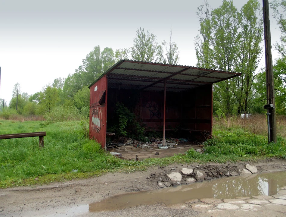 Obrazu opuszczenia dopełniają resztki przystanku autobusowego.