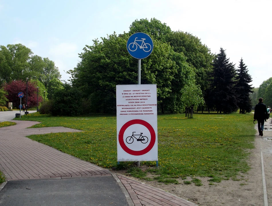Przez stację benzynową na Ordona docieramy do Prymasa Tysiąclecia, potem tunelem do Bitwy Warszawskiej i drogą dla rowerów na Banacha jedziemy w stronę Pola Mokotowskiego. A tu zakaz rowerowania – dzisiaj Dzień Ziemi.