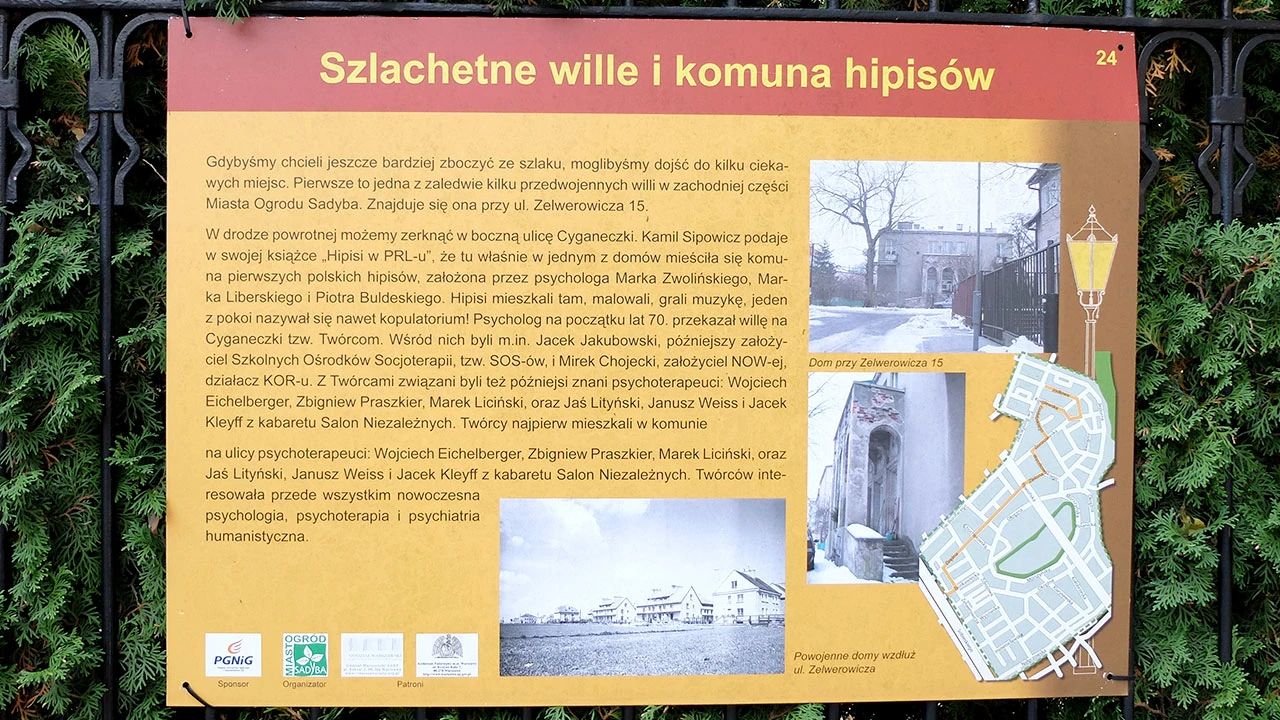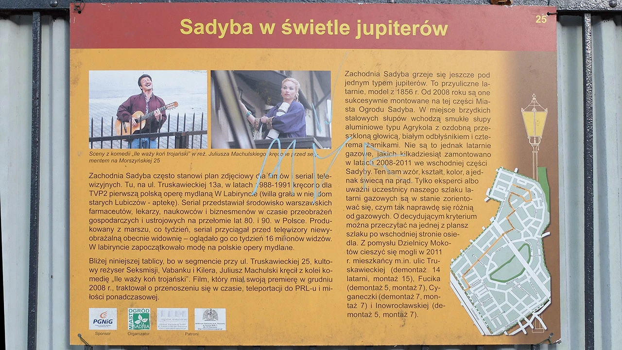 Przy Orężnej spotykamy tablice szlaku latarń gazowych. Nie wiedzieliśmy, że latarnie tutaj przetrwały. Szlak jest pięknie opisany i oznakowany. Tablice pokazują kawał historii Warszawy i polskich hipisów. I jednocześnie kawał historii polskiej psychologii i socjoterapii, kabaretu czy opozycji lat siedemdziesiątych i osiemdziesiątych.