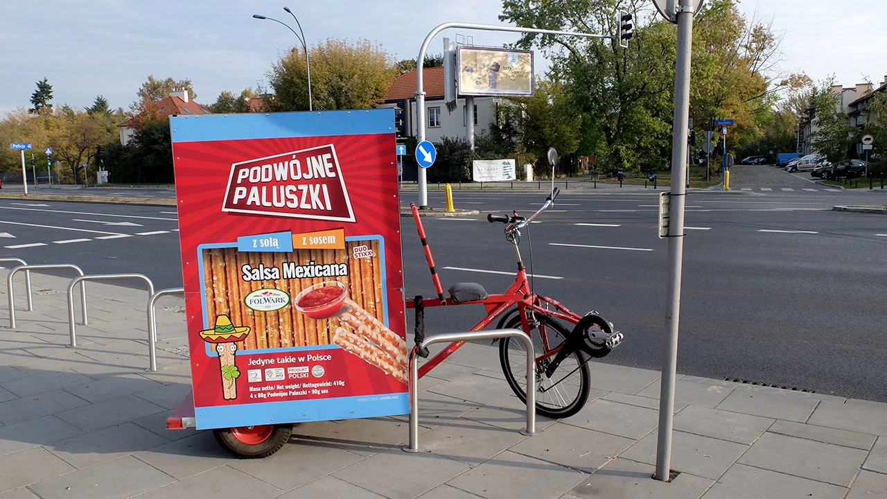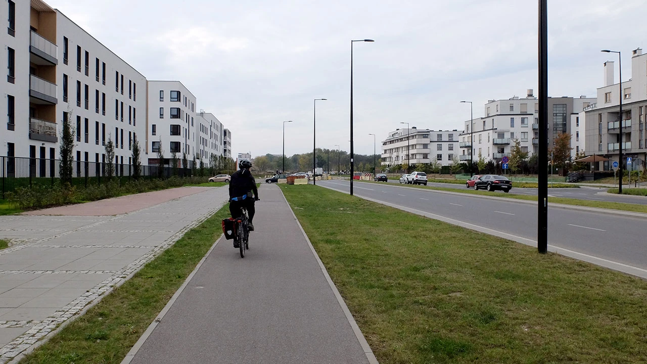 Ruszamy w stronę Wilanowa, choć Wilanów w zasadzie za rogiem. Po drodze zatrzymuje nas dziwaczny rower reklamowy – ma dziwnie rozwiązane przerzutki. Trochę zaskakuje nas dobra jakość infrastruktury wzdłuż Powsińskiej – dawno nas tu nie było, a tu miła niespodzianka, droga elegancka. Robi się piękne połączenie od Mostu Siekierkowskiego w stronę Konstancina.