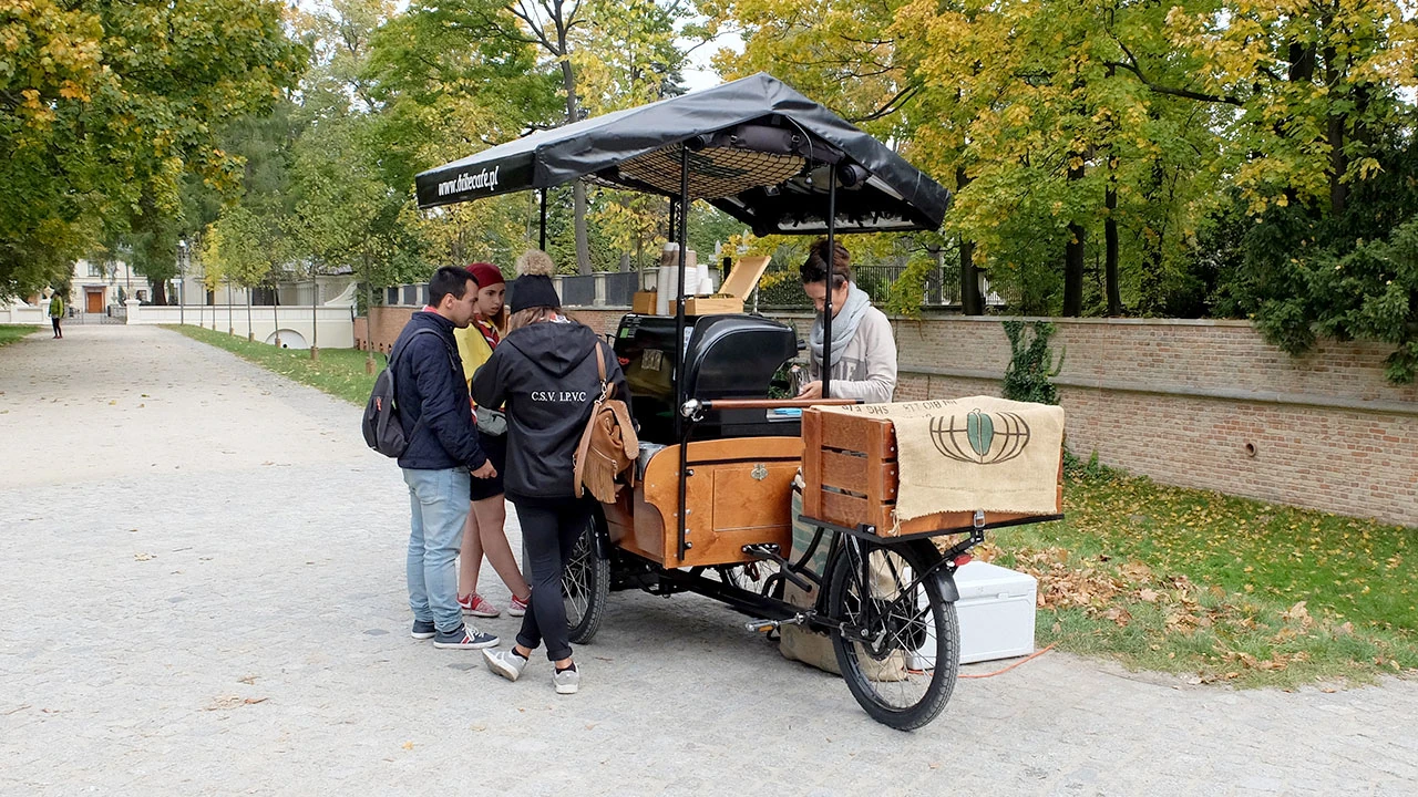 I tak trochę mimochodem, znajdujemy się na terenie zespołu pałacowo-parkowego. Okazuje się, że popełniamy wykroczenie spacerując z naszymi rowerami. Ciekawe jak z tym zakazem radzi sobie pani sprzedająca kawę z roweru.
