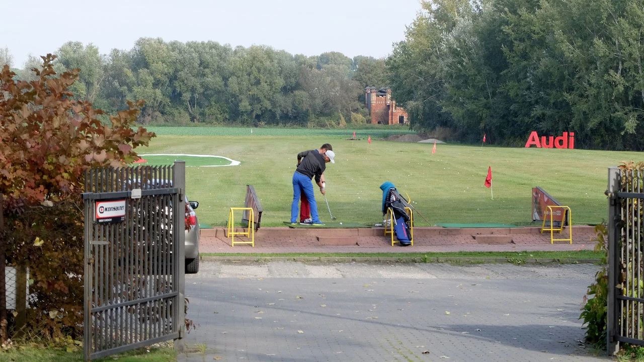 Wzdłuż Vogla (malarza zwanego Ptaszkiem) jedziemy w stronę rzeczki Wilanówka. I widok dziarskich graczy w golfa objawia się nam. Uczą się wyginać tułów i walić w piłeczki.
