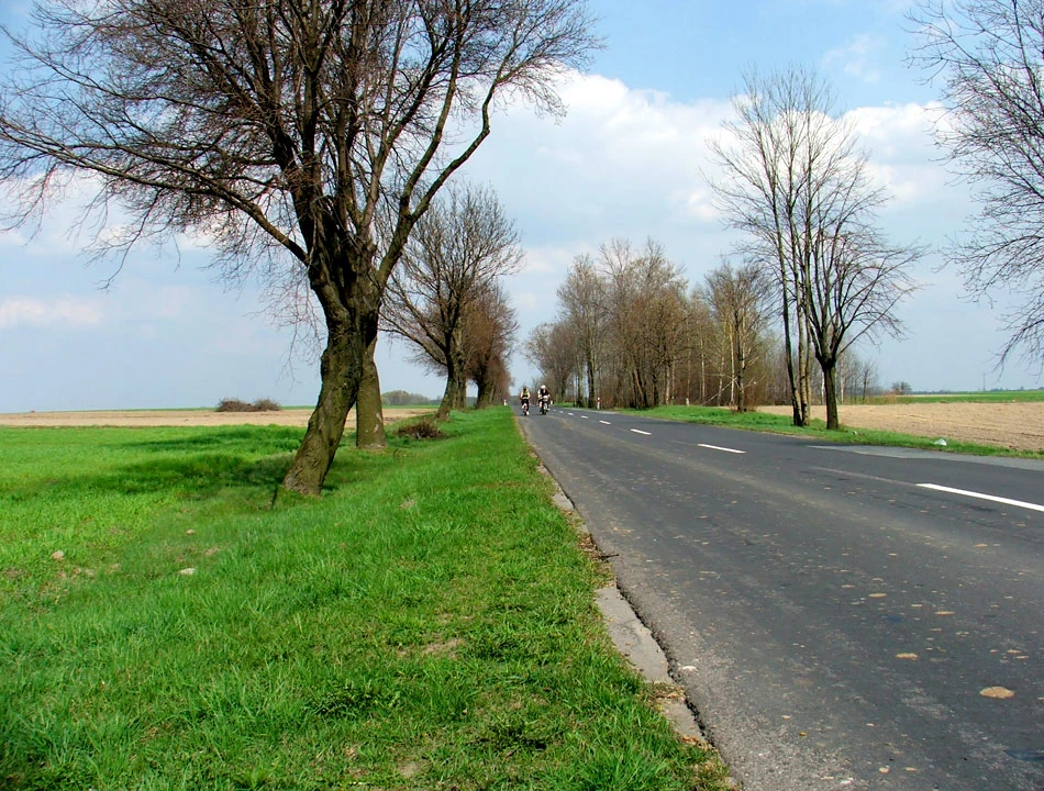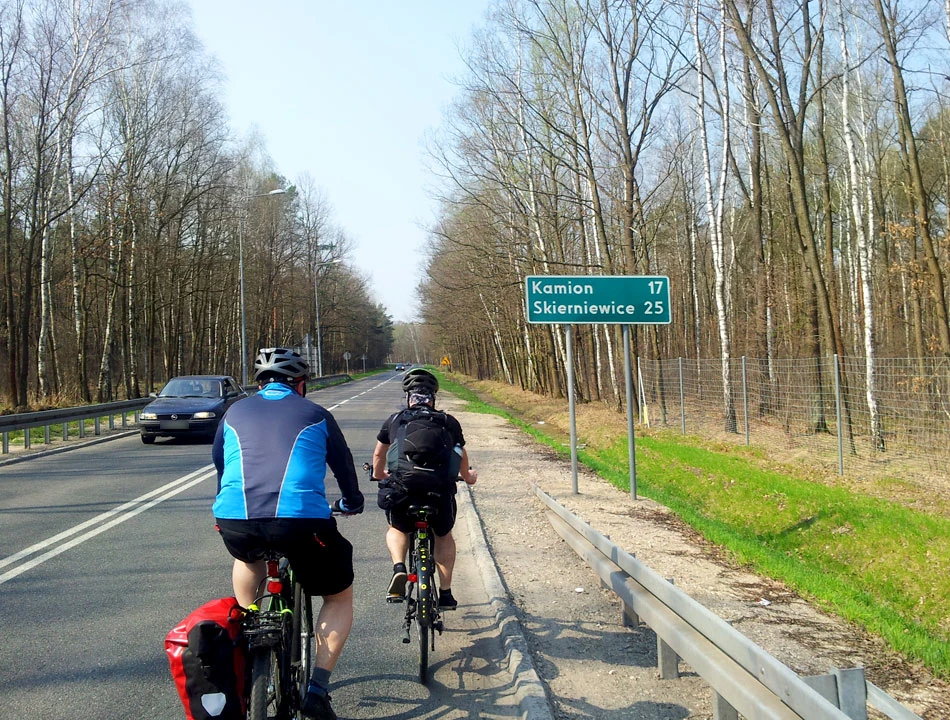 Za Skierniewicami pogoda jeszcze ładniejsza niż dotychczas – jest słoneczniej i cieplej. Jednak nadal mocno wieje, momentami tak, że wiatr spowalnia nas nawet na zjazdach. No i zaczęły się też pagórki. Do tej pory było w miarę płasko: w Warszawie zaczynaliśmy na wysokości 82 m n.p.m., w Skierniewicach byliśmy na 86 m n.p.m. Teraz teren wyraźnie się wznosi.