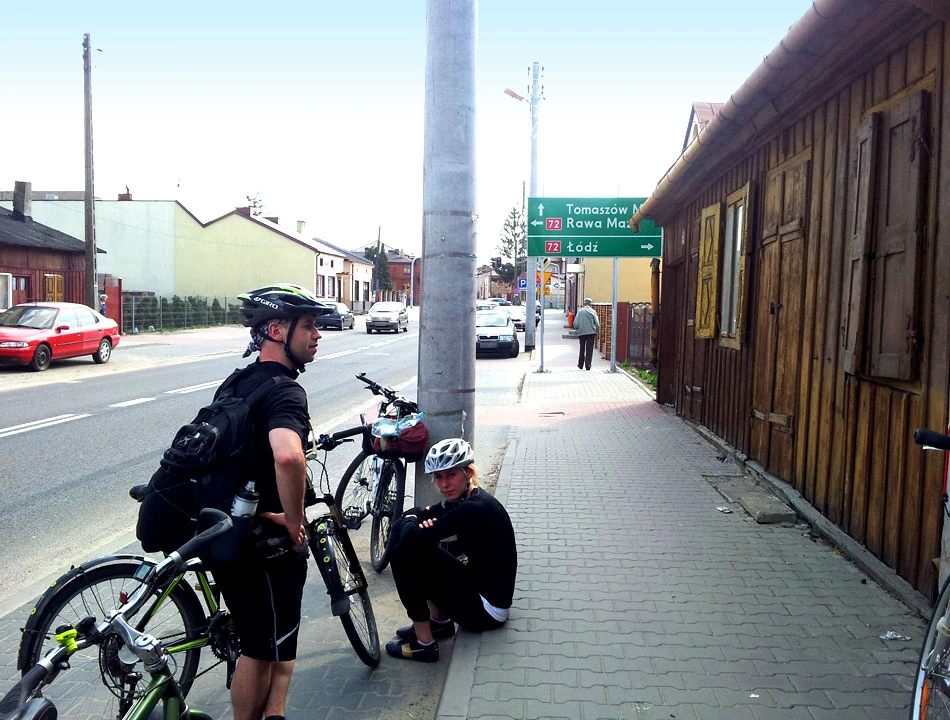 Przed nami ostatni odcinek drogi, jednak dość trudny, bo Łódź leży na wysokości 239 m n.p.m. Do miejsca zbiórki Masy Krytycznej mamy do przejechania jeszcze jakieś 25 kilometrów. Wzmocnieni odpoczynkiem dziarsko ruszamy, już niemal świętując sukces. I nagle kicha, taka prawdziwa – Piotrek łapie gumę. Zmieniamy dętkę, ale nie idzie to tak szybko jak byśmy chcieli. Udział w Masie oddala się.