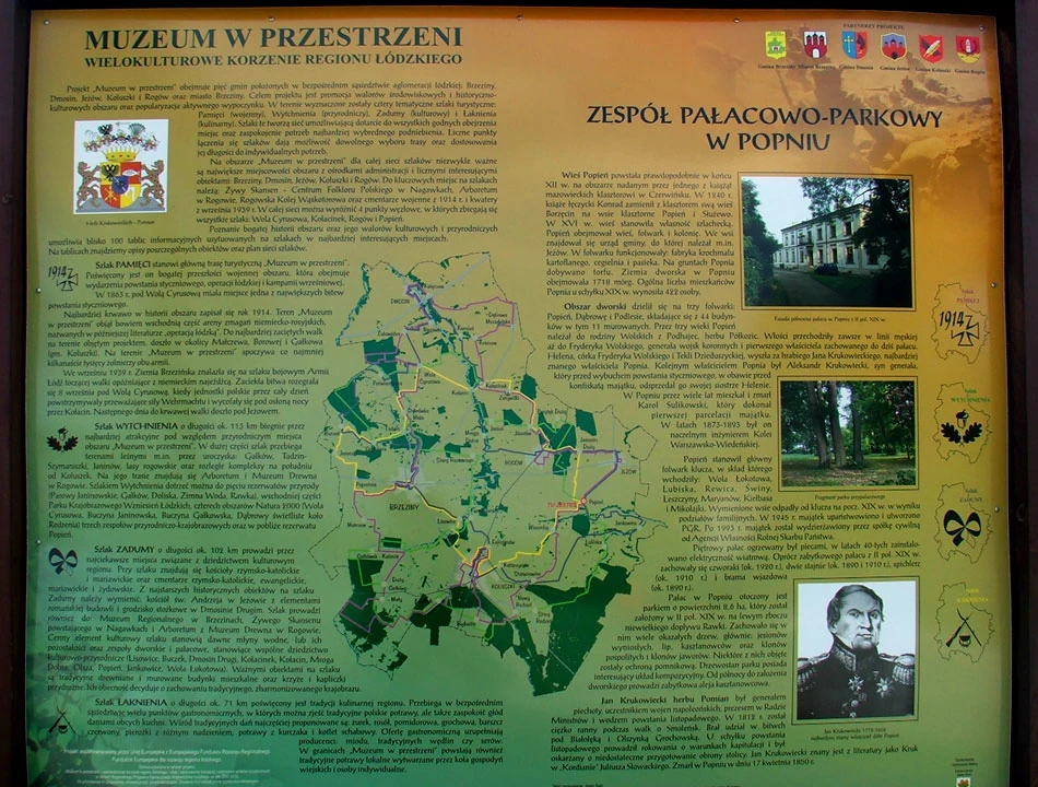 Pośrodku niczego spotykamy tablicę zachęcającą do zwiedzania okolic szlakami Pamięci, Zadumy, Wytchnienia i Łaknienia.