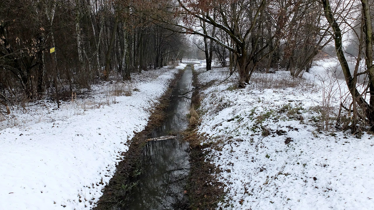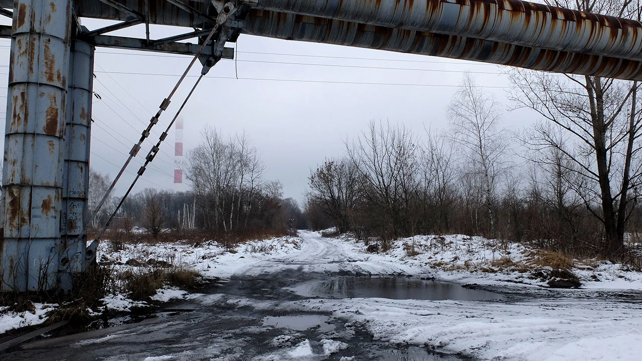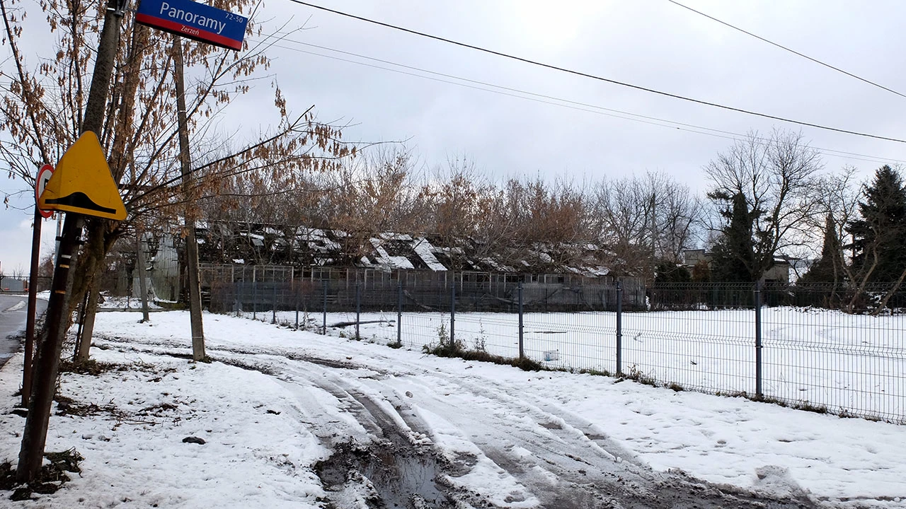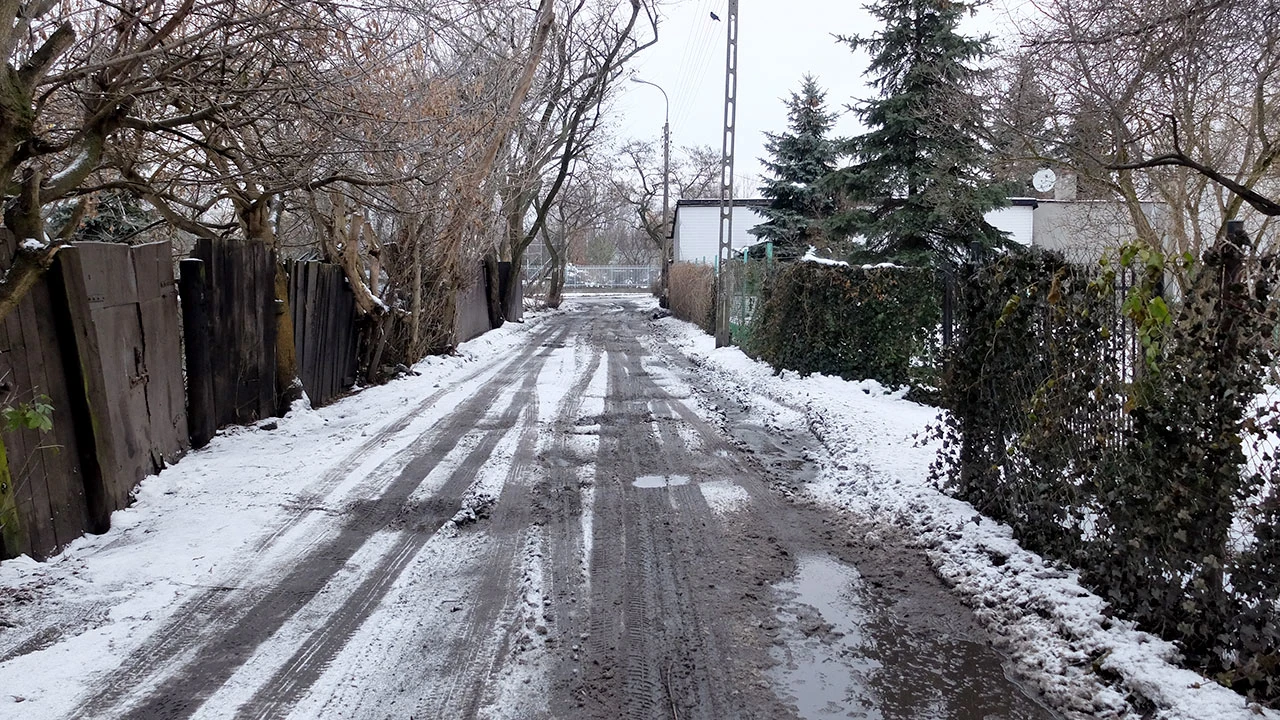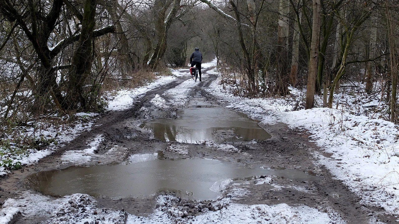Majaczy nam we mgle komin Kawęczyna i w tamtą stronę ruszamy. Zawierzamy swój los, zaznaczonej na mapie, ulicy Skorpiona. Szybko się okazuje, że to nie ulica, a raczej grobla pośród mokradeł. Brodzimy w błocie, przeskakujemy przez powalone pnie i taplamy się w śniegu. Momentami raczej pchamy rowery niż jedziemy.