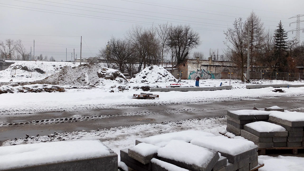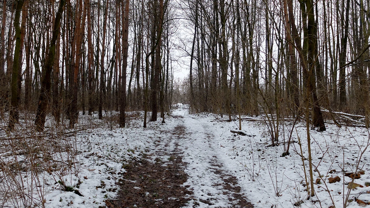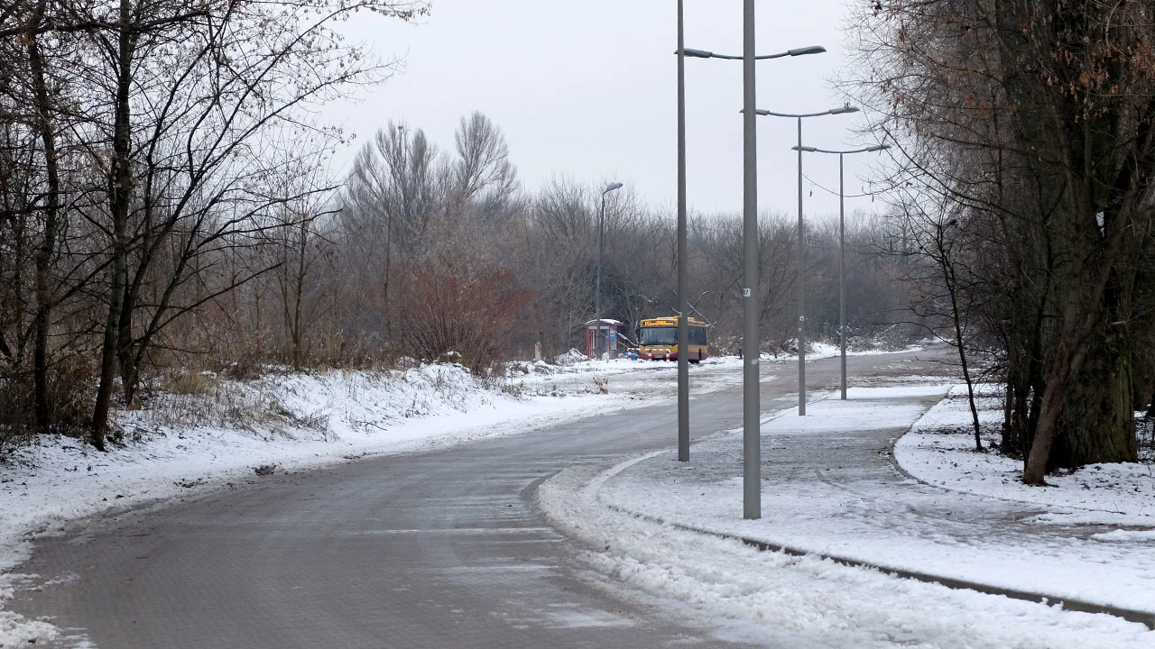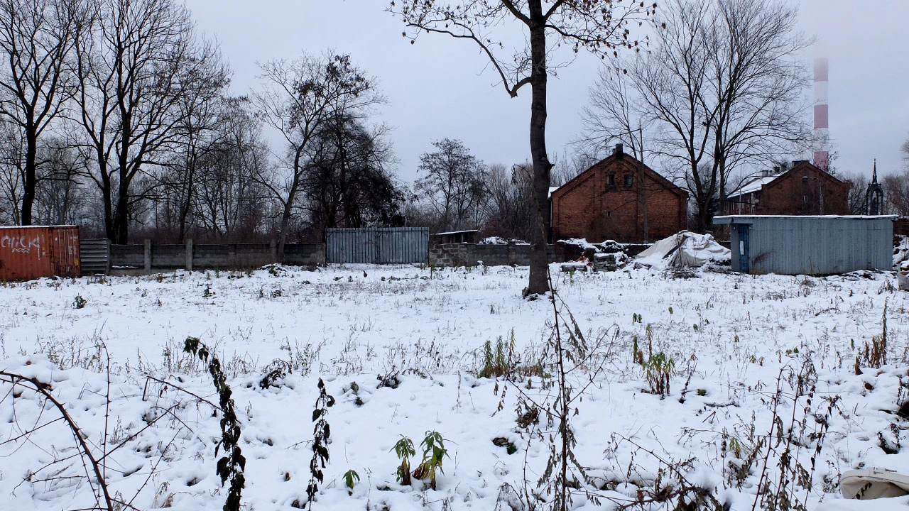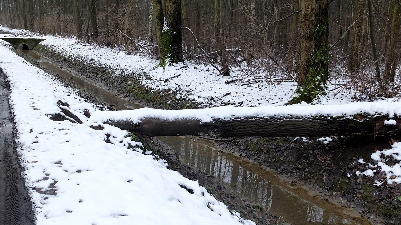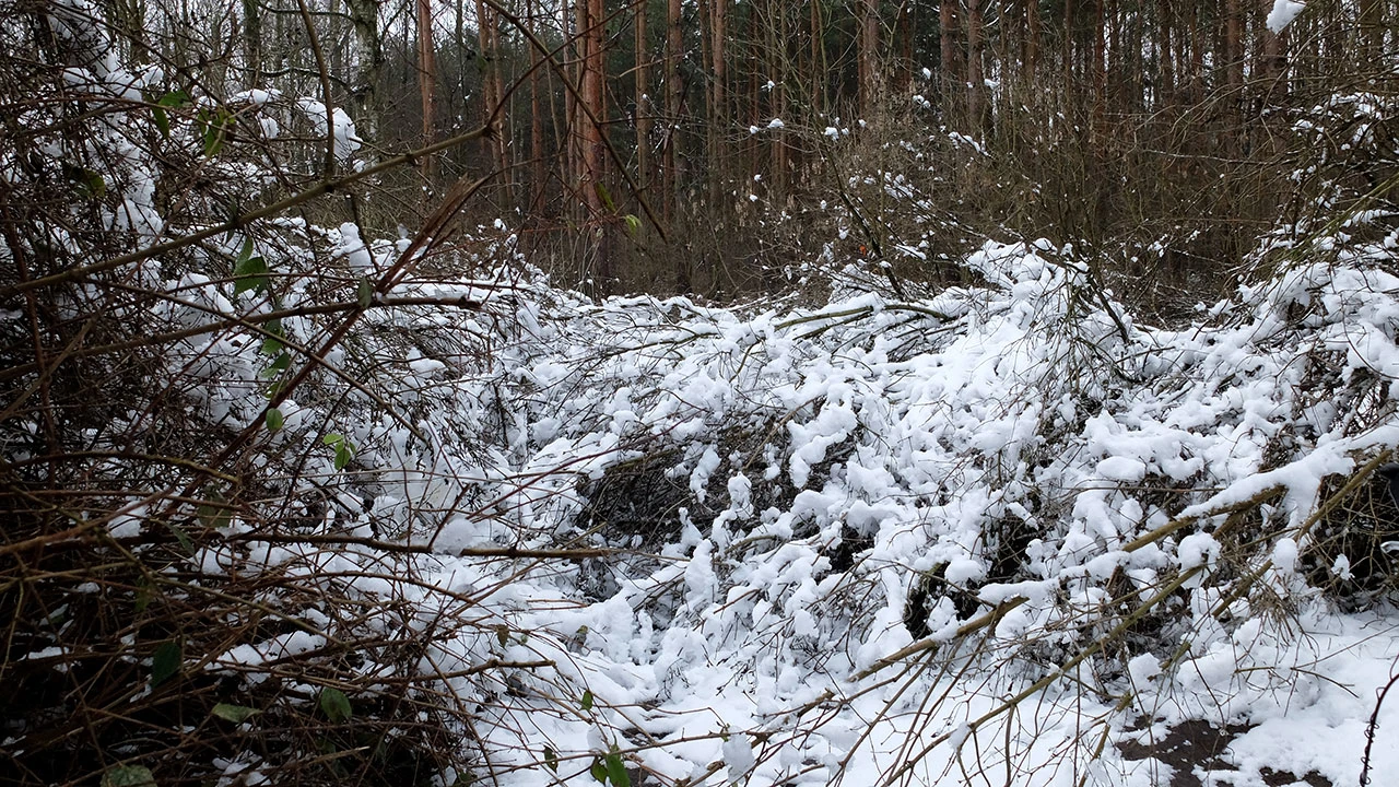 Majaczy nam we mgle komin Kawęczyna i w tamtą stronę ruszamy. Zawierzamy swój los, zaznaczonej na mapie, ulicy Skorpiona. Szybko się okazuje, że to nie ulica, a raczej grobla pośród mokradeł. Brodzimy w błocie, przeskakujemy przez powalone pnie i taplamy się w śniegu. Momentami raczej pchamy rowery niż jedziemy.