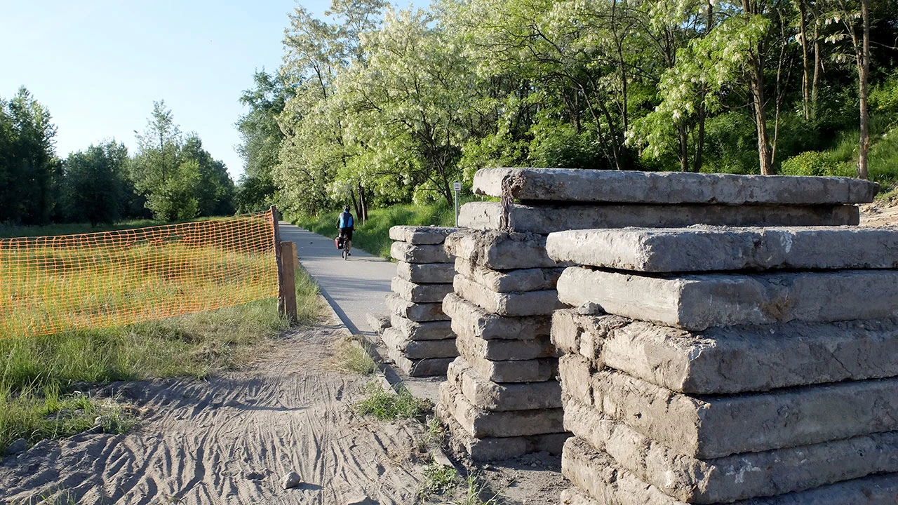 Powalający, dosłownie, jest sposób poinformowania pieszych i rowerzystów o pracach budowlanych – płyty betonowe wprost blokują drogę.