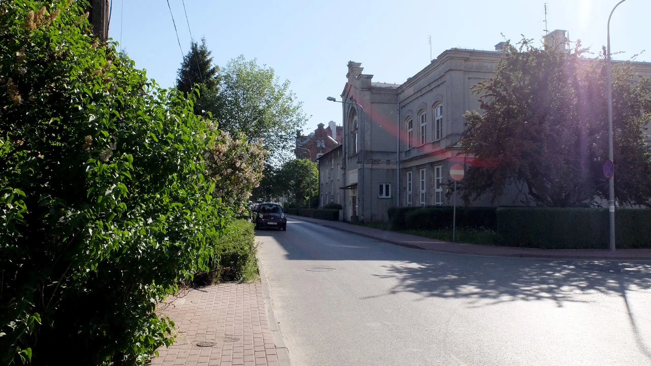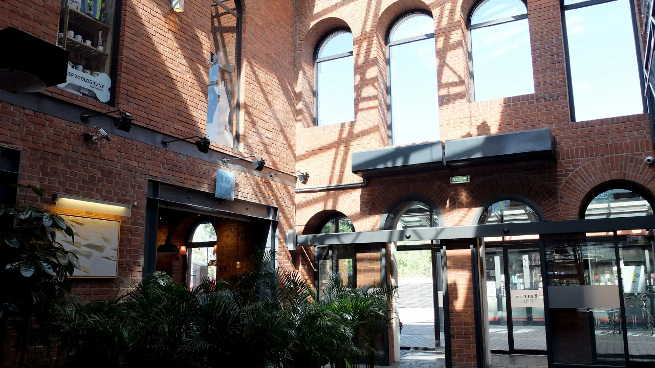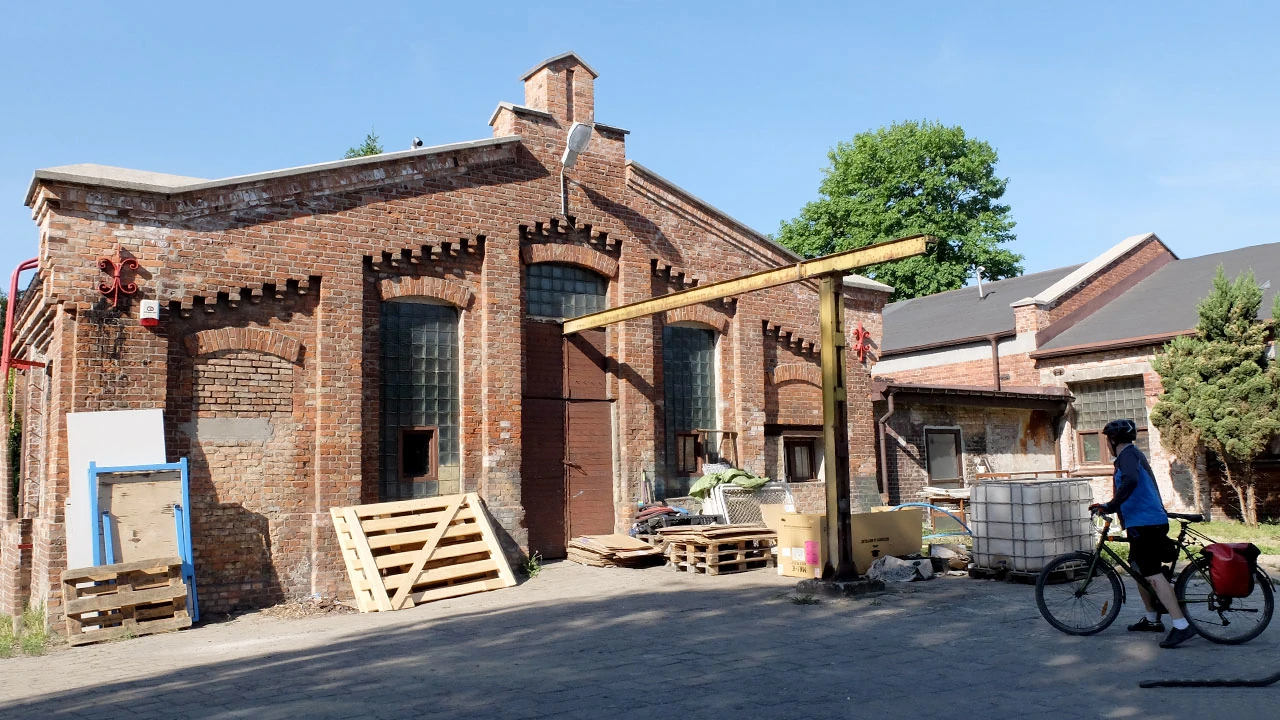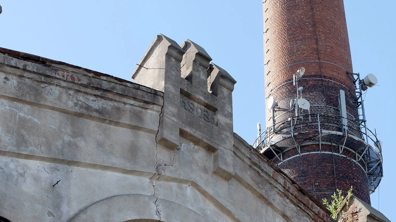 Taka sama czerwona cegła, podobne zdobienia, i w tle fabryczny komin.
