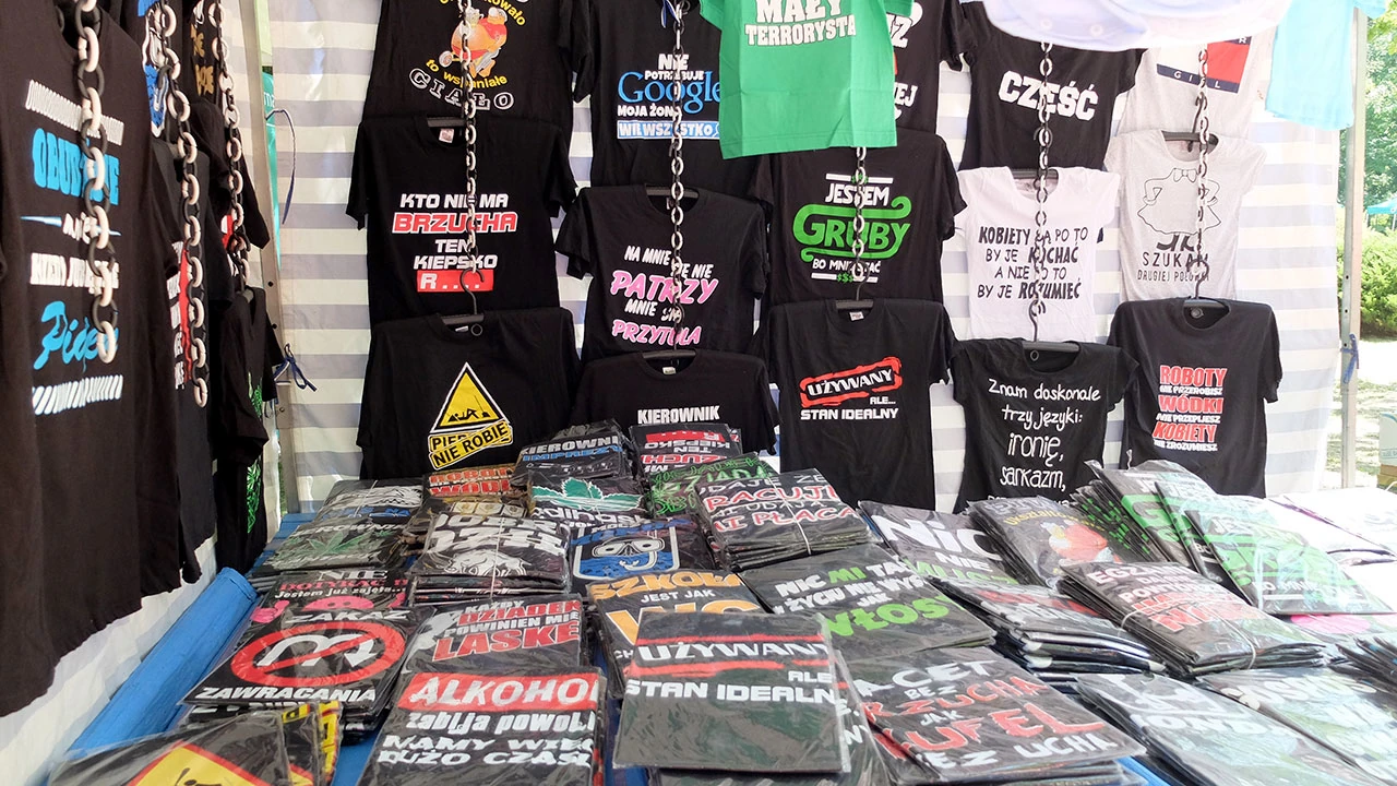 Pasiaste namioty szczelnie zastawiają alejki, samochody trawniki. Na straganach pełno chłamu. Włącznie z koszulkami z głupimi napisami.