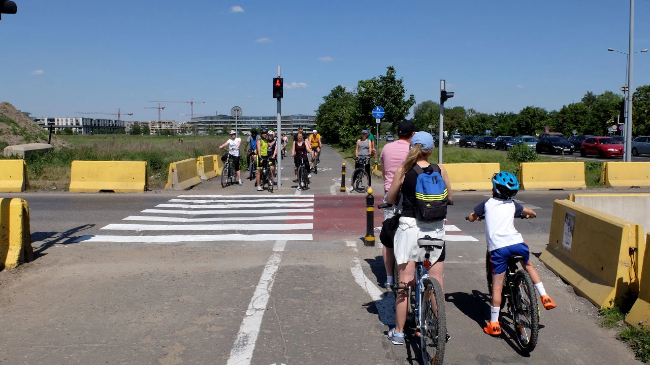 A tam tłum rowerkowców. To pewnie mieszkańcy Miasteczka Wilanów korzystają z ładnej pogody.