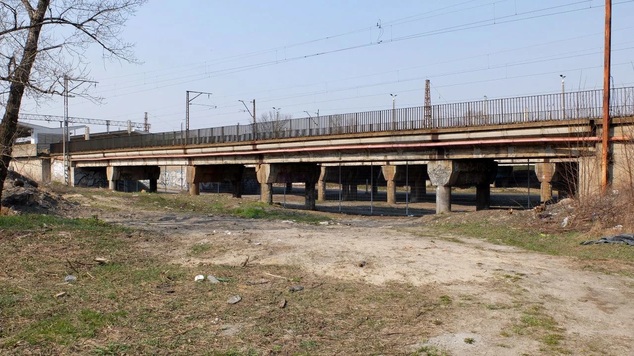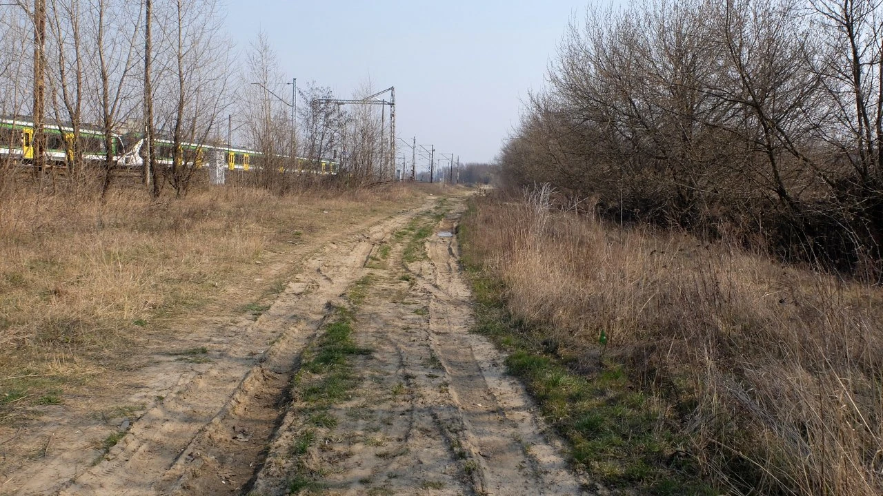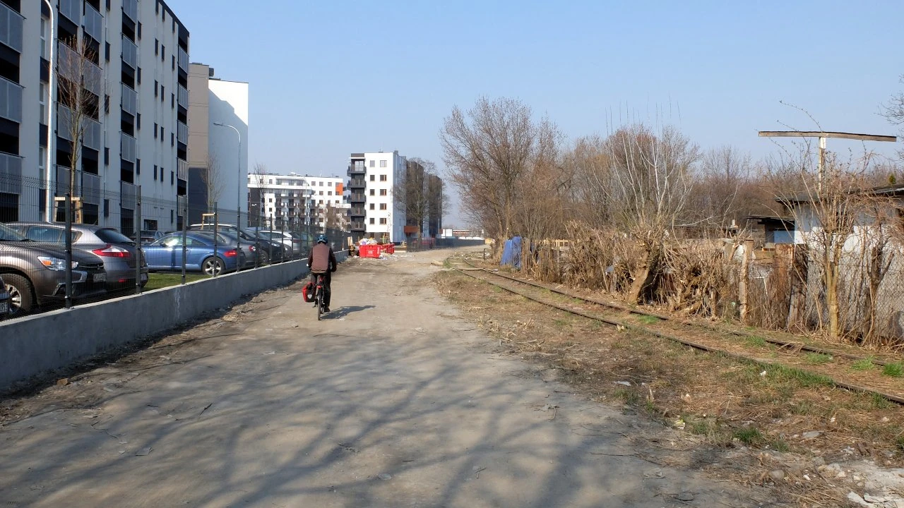 Jedziemy wzdłuż torów w kierunku odwrotnym niż brama, zmierzających w stronę Podskarbińskiej. Po lewej mijamy zaplecza osiedli, frontem sięgających do Chrzanowskiego.