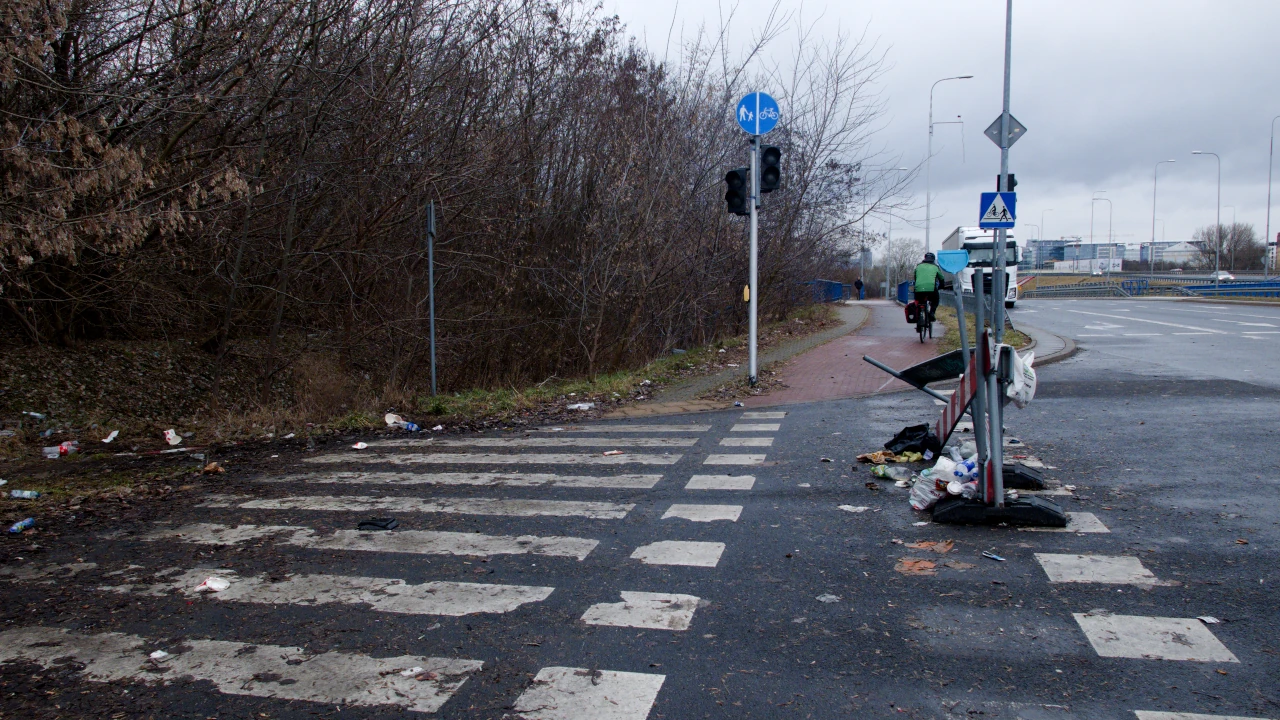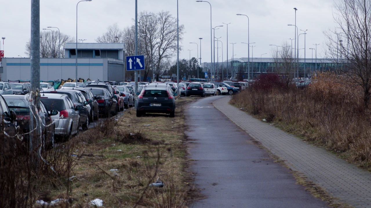Na tyłach lotniska syf i samochodowy ściek. Porozrzucane śmiecie i blachosmrody (jak mawia nasz kolega Marek, autor bloga i fanpejdżu Rowerowawa) zaparkowane gdzie popadnie – byle tylko zaoszczędzić parę moniaków.