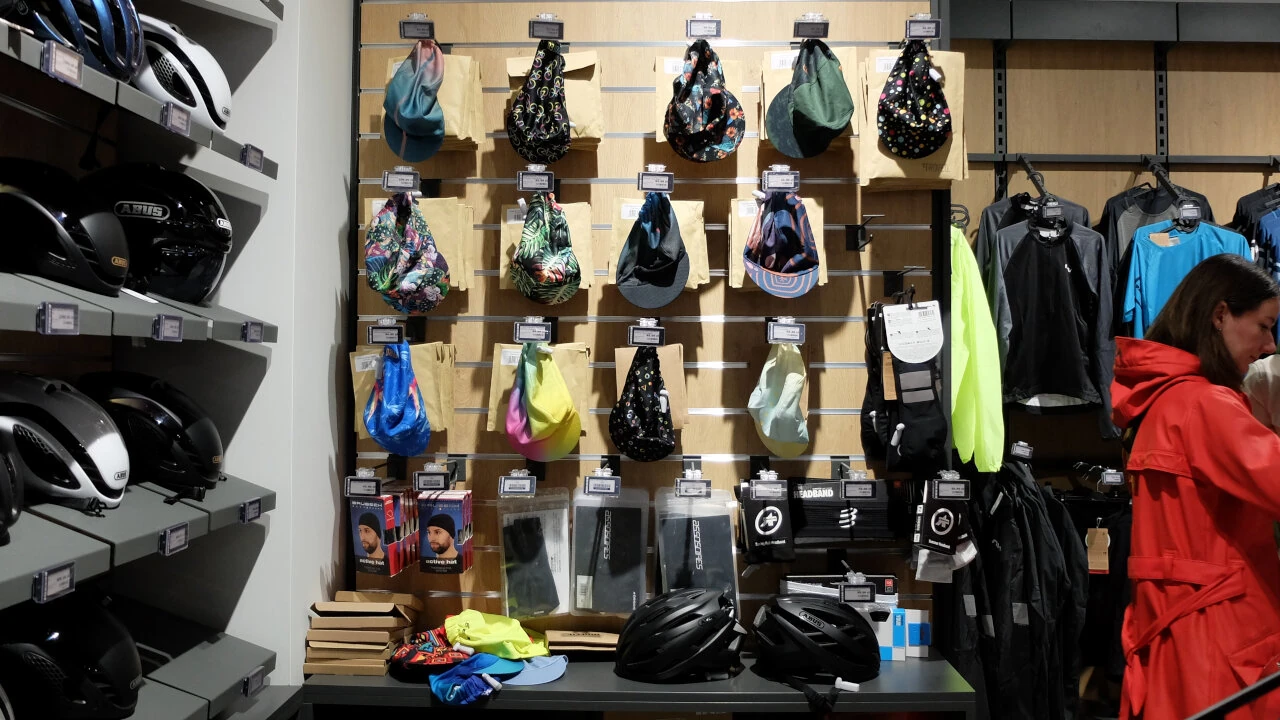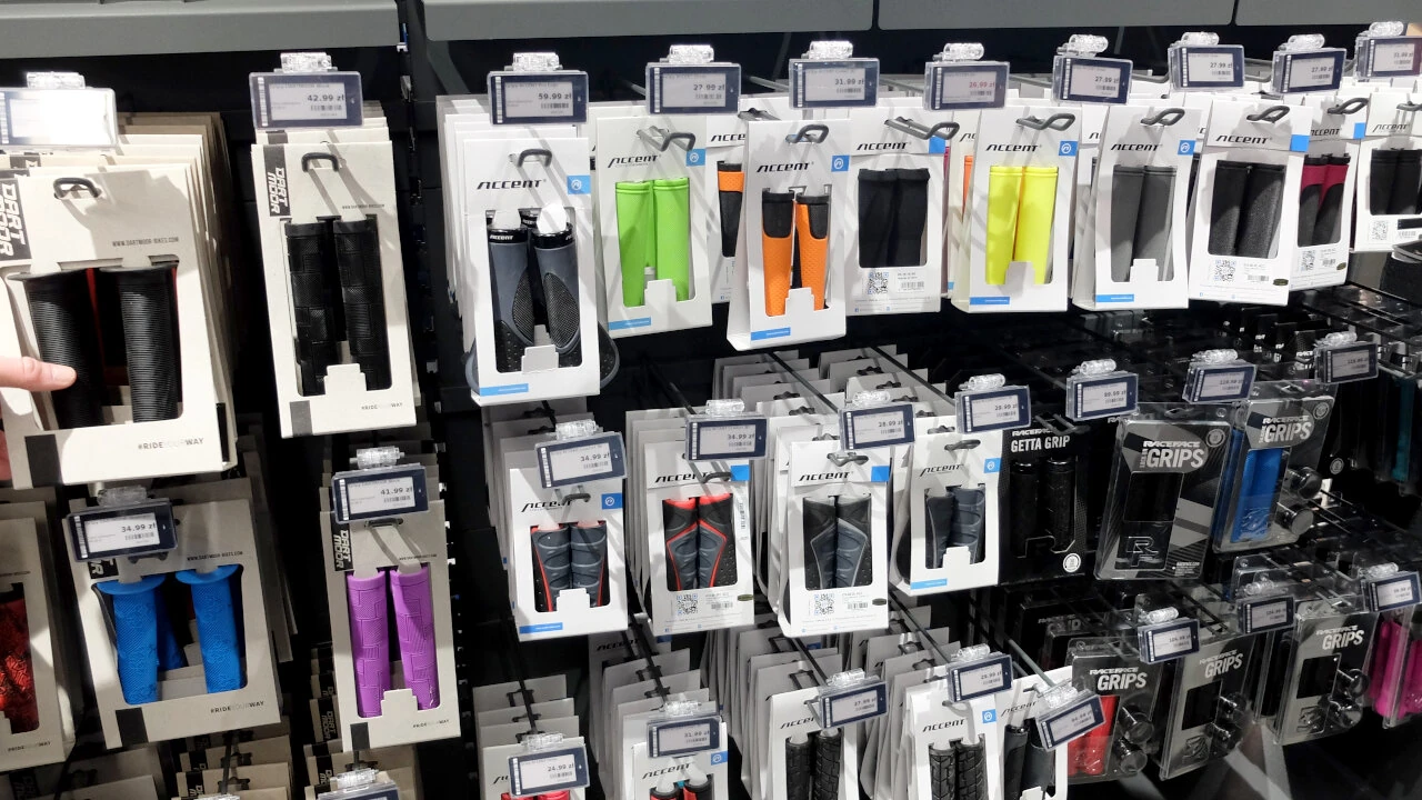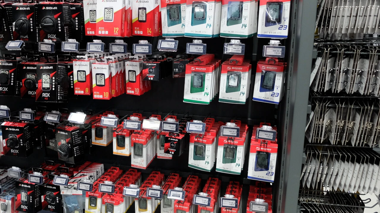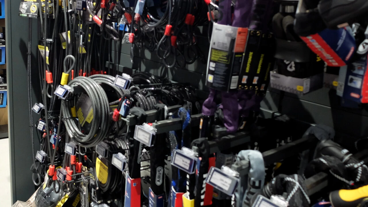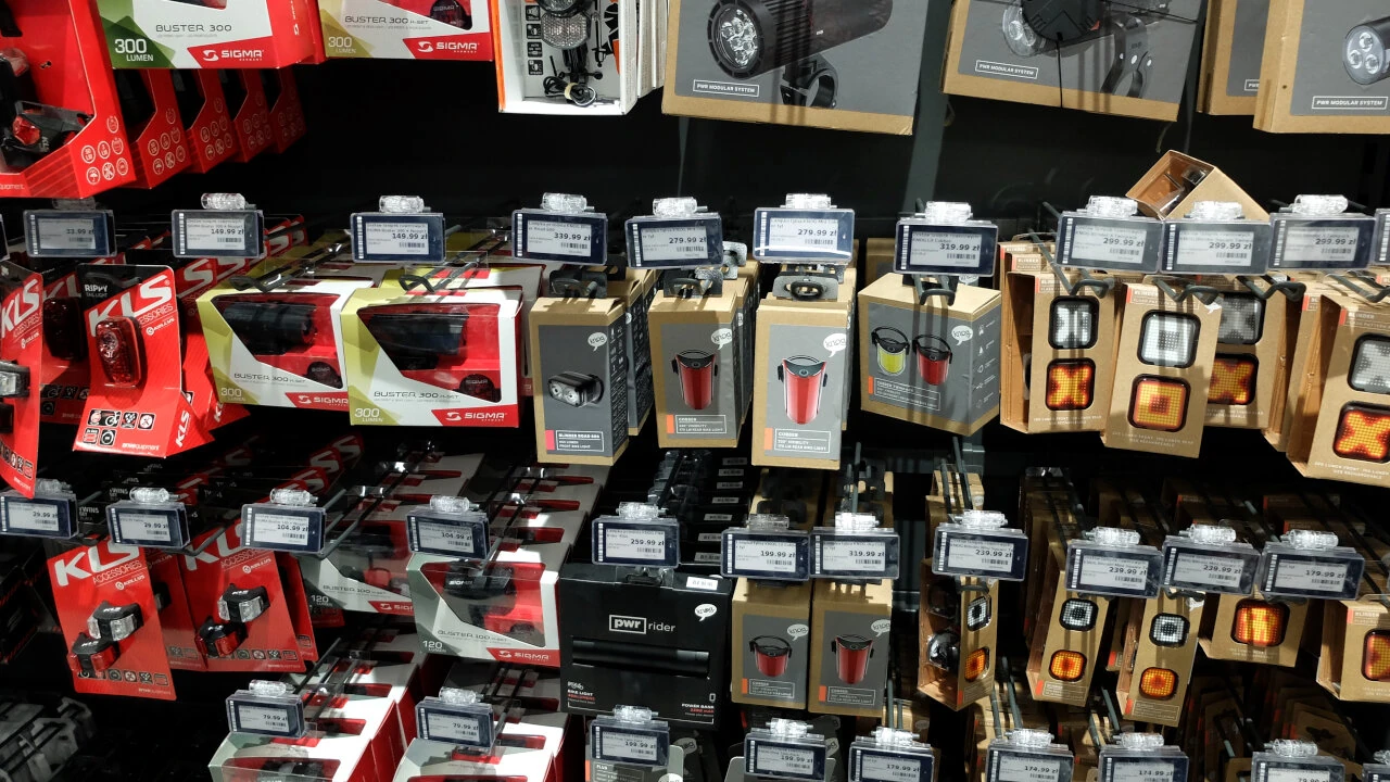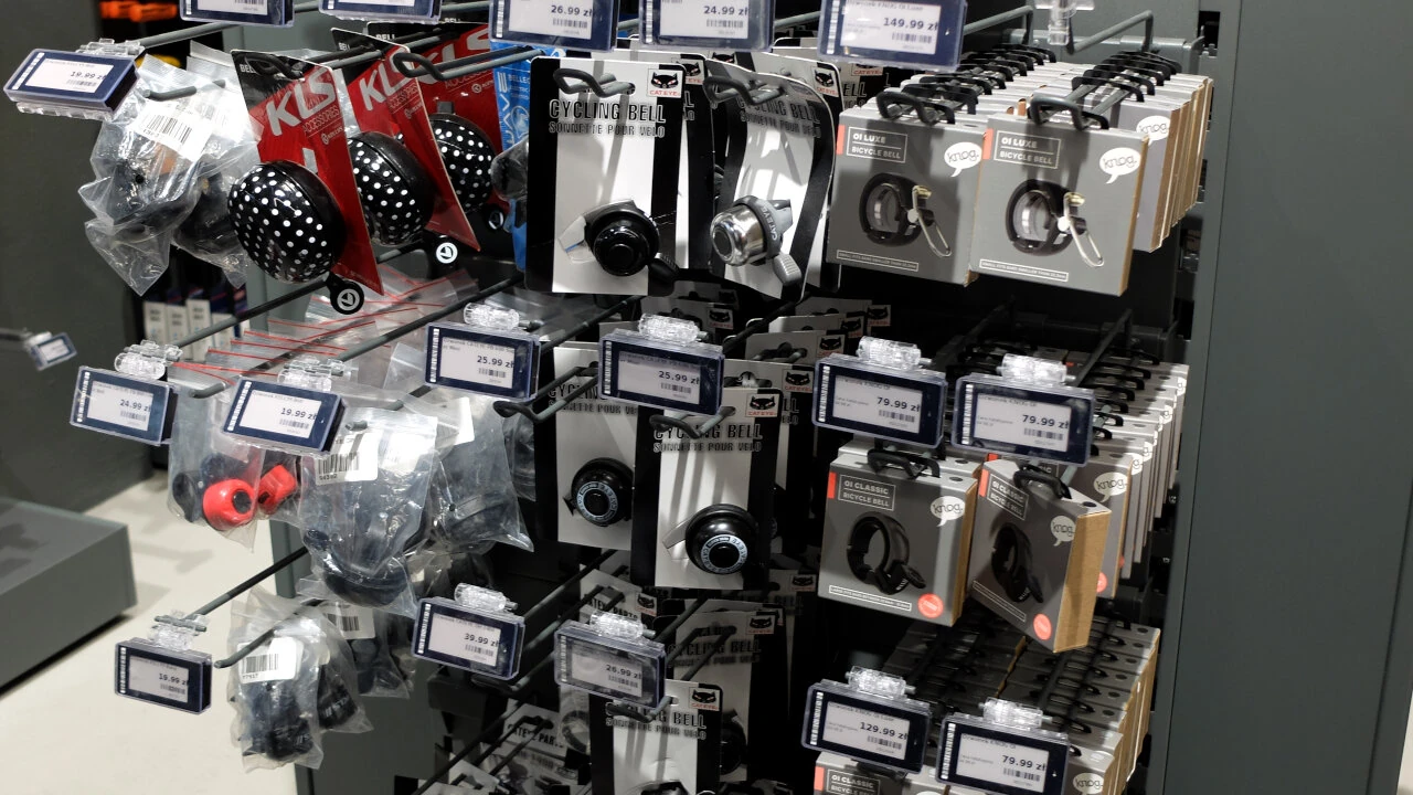 Wybór akcesoriów jest imponujący. Tłum liczników rowerowych. Zapięć: od linek, poprzez o-locki po u-locki. Są dzwonki i lampki.