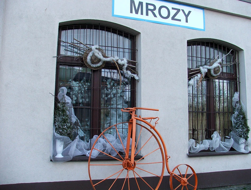 Przygnieceni nieco symbolami ruszamy w stronę Mrozów, bo stamtąd mamy pociąg do domu. Przy stacji stoi piękny bicykl, jednak bez oponek – jeździć nie bardzo się da. A przed budynkami stacyjnymi i na nich, dwa kolejne świadectwa historii.