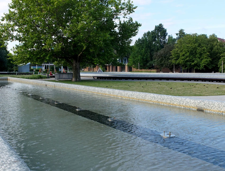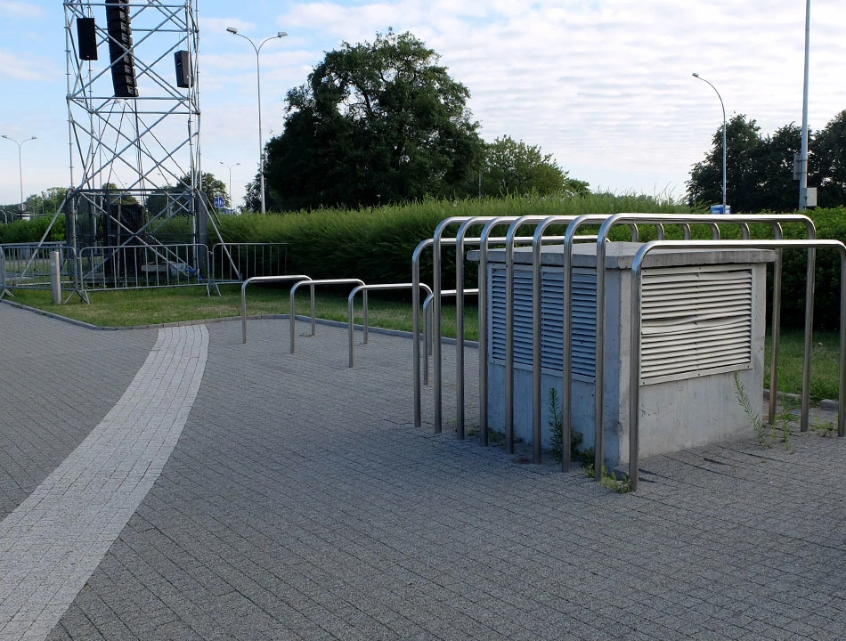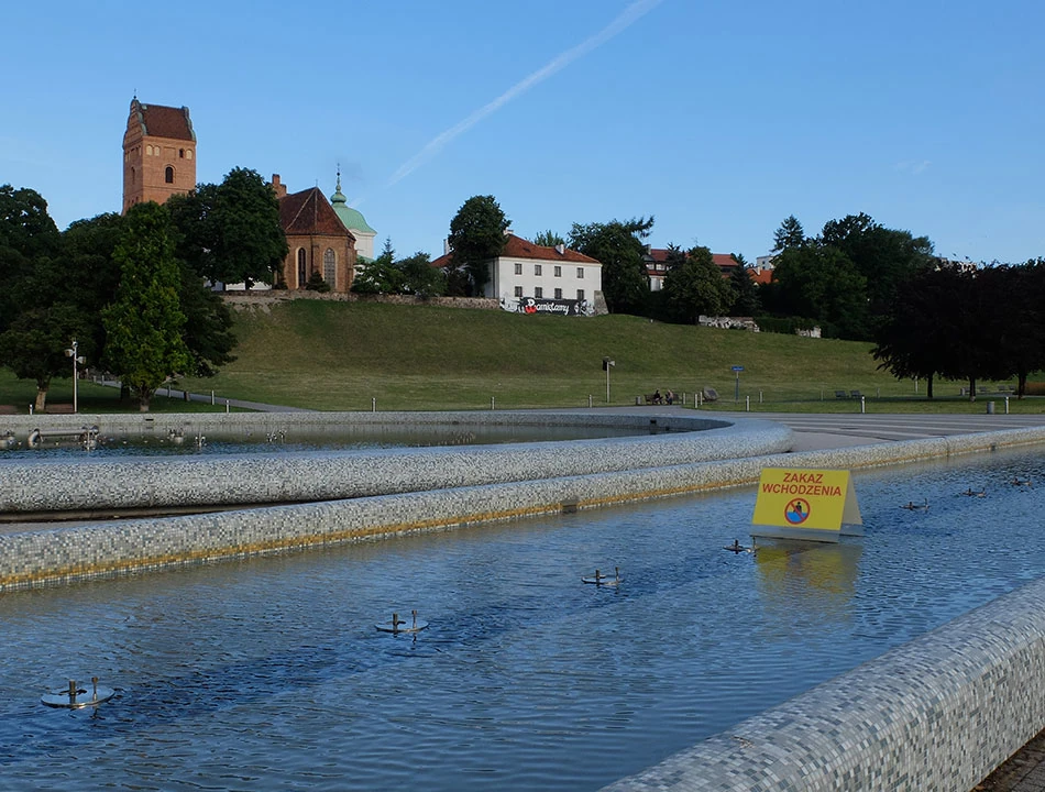 Ruszamy zatem w stronę Starówki. Najpierw przez Pragę i Jagiellońską w stronę Mostu Gdańskiego. Pogoda jest ładna: słonecznie, niezbyt wietrznie, idealna do szybkiego ataku szczytowego. Pokonujemy Wisłę i dalej jedziemy u podnóża skarpy wiślanej. Nie widać na razie pierwszego celu naszej wyprawy — Góry Gnojnej. Mijamy pusty o tej porze Park Fontann. Woda nie sika, za to widać ornamentykę odwołującą się do rowerowej infrastruktury.