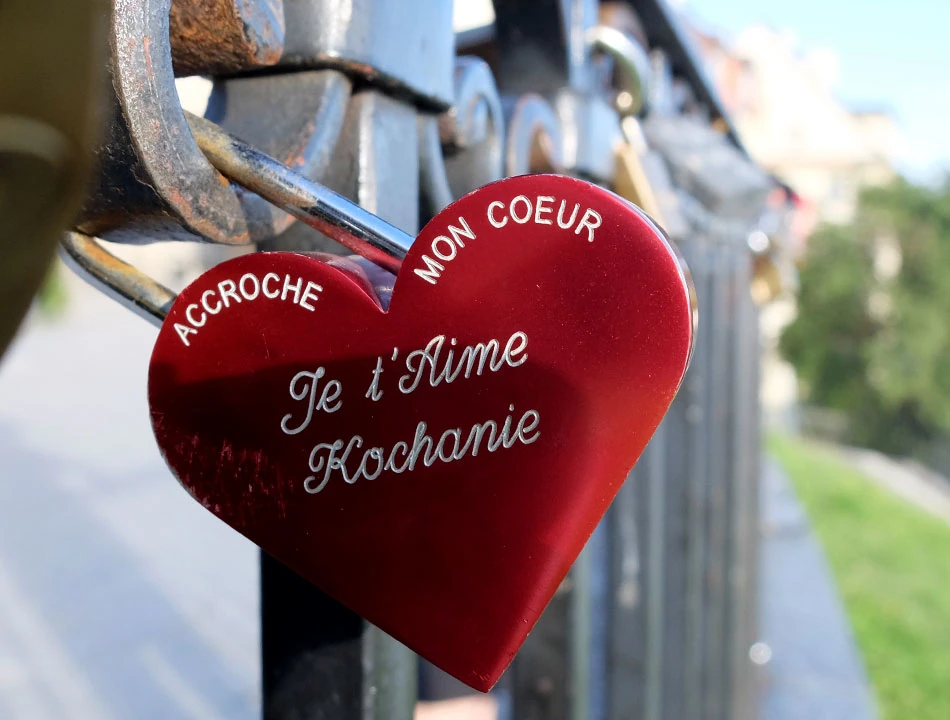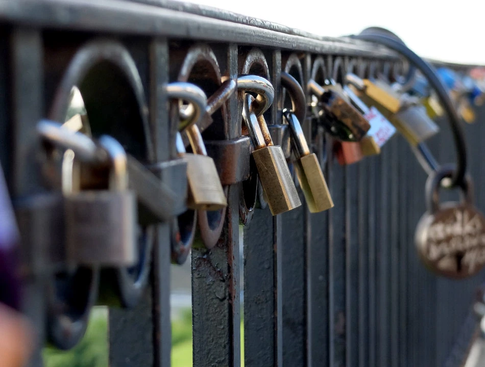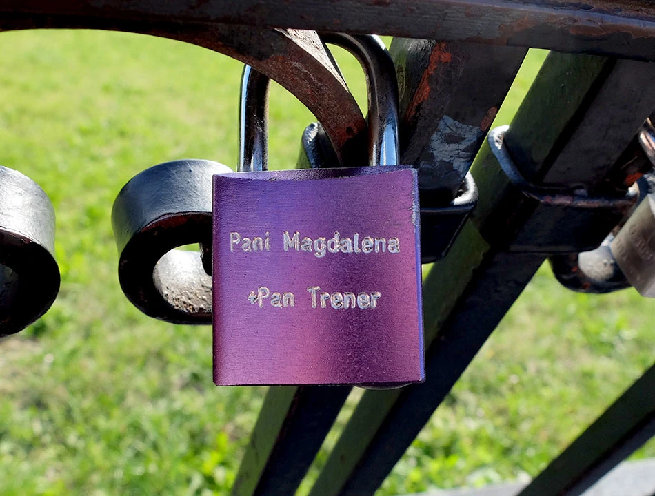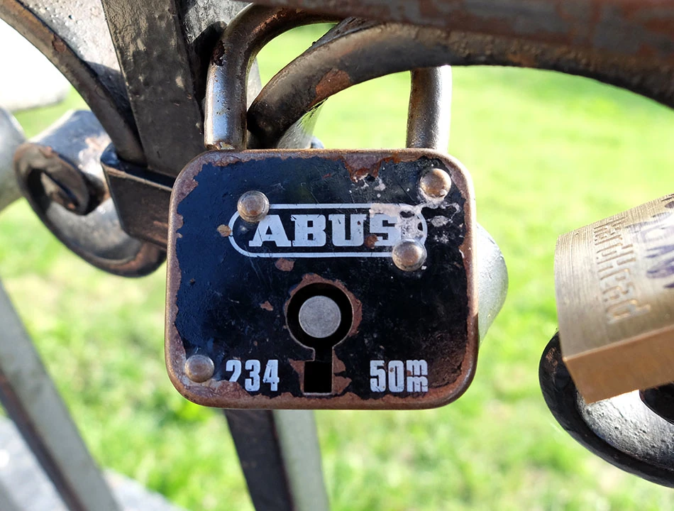 Na barierce na Górze Gnojnej wisi rząd kłódek. To wciąż nowa, ale już utrwalona, świecka tradycja. Zawieś kłódkę, klucz wrzuć do rzeki, a twa miłość będzie trwać na wieki, czy jakoś tak. Nas zainteresowała szczególnie kłódka firmy Abus, bo jak wiadomo, produkuje ona doskonale zapięcia do rowerów. Marcin jest dumnym posiadaczem takiego ustrojstwa, ważącego kilka kilogramów. Waga jest o tyle istotna, bo zdobywanie szczytów z czymś takim jest dodatkowo utrudnione.