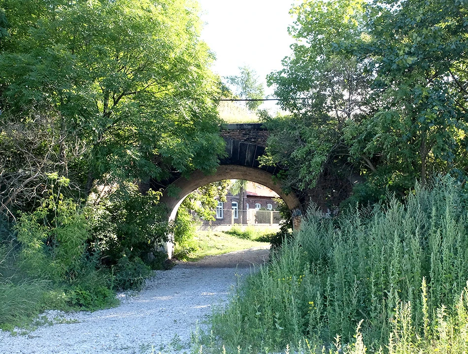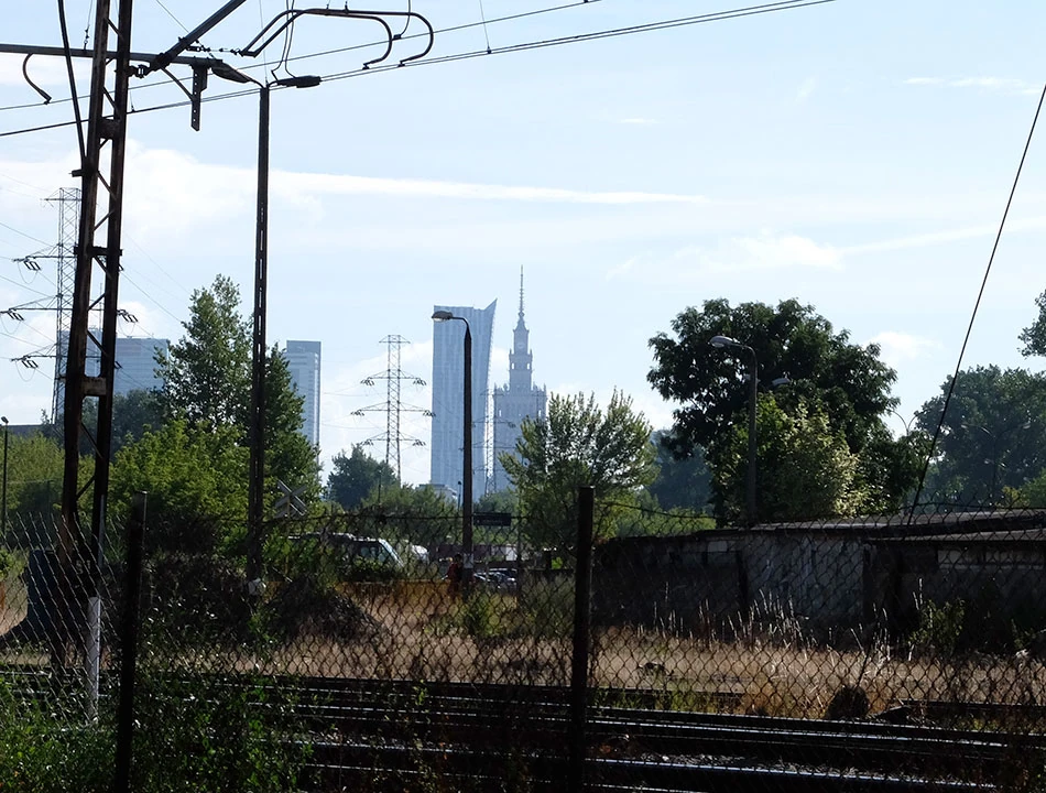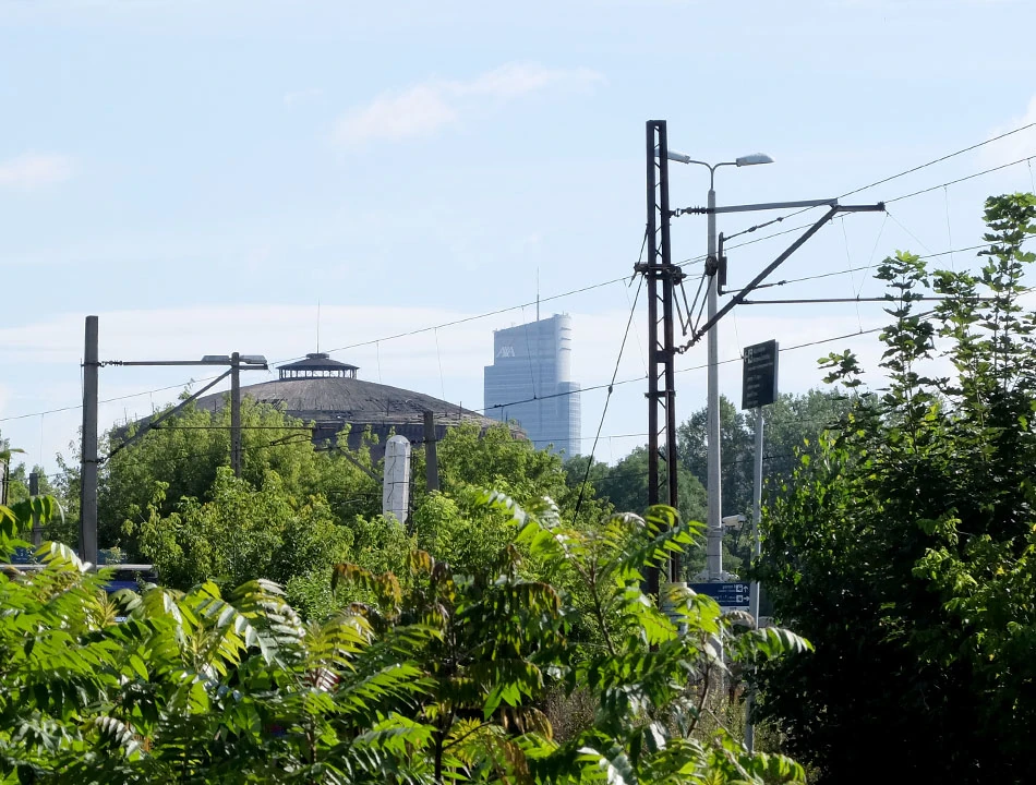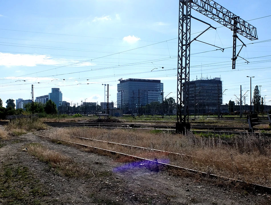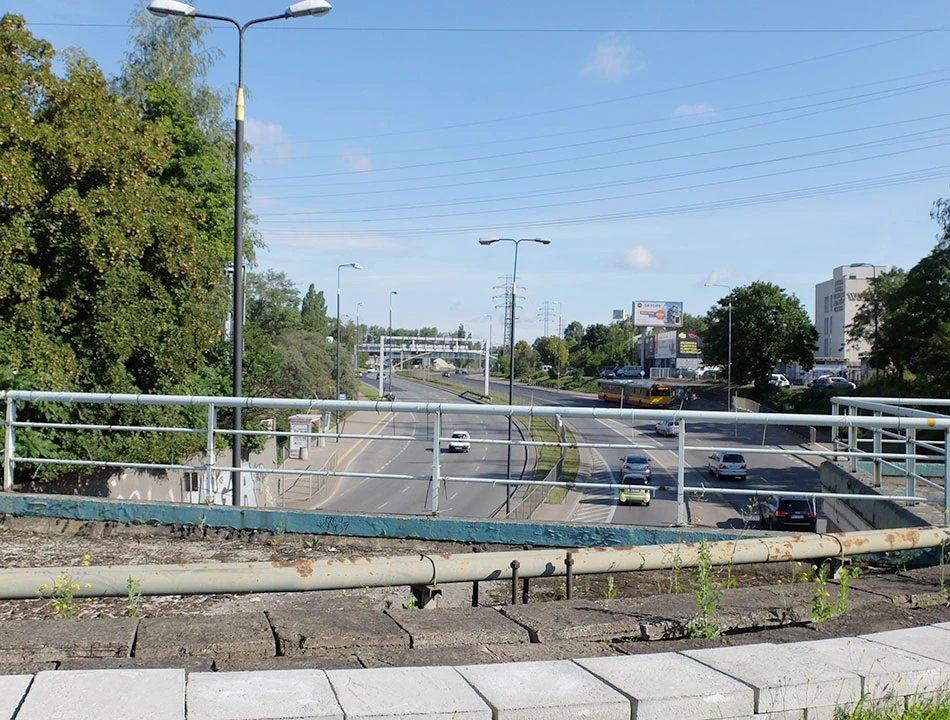 Armatnią przedostajemy się nad tunelem, w którym biegnie aleja Prymasa Tysiąclecia. Obok widać Dworzec Zachodni, panoramę Woli i Śródmieścia.
