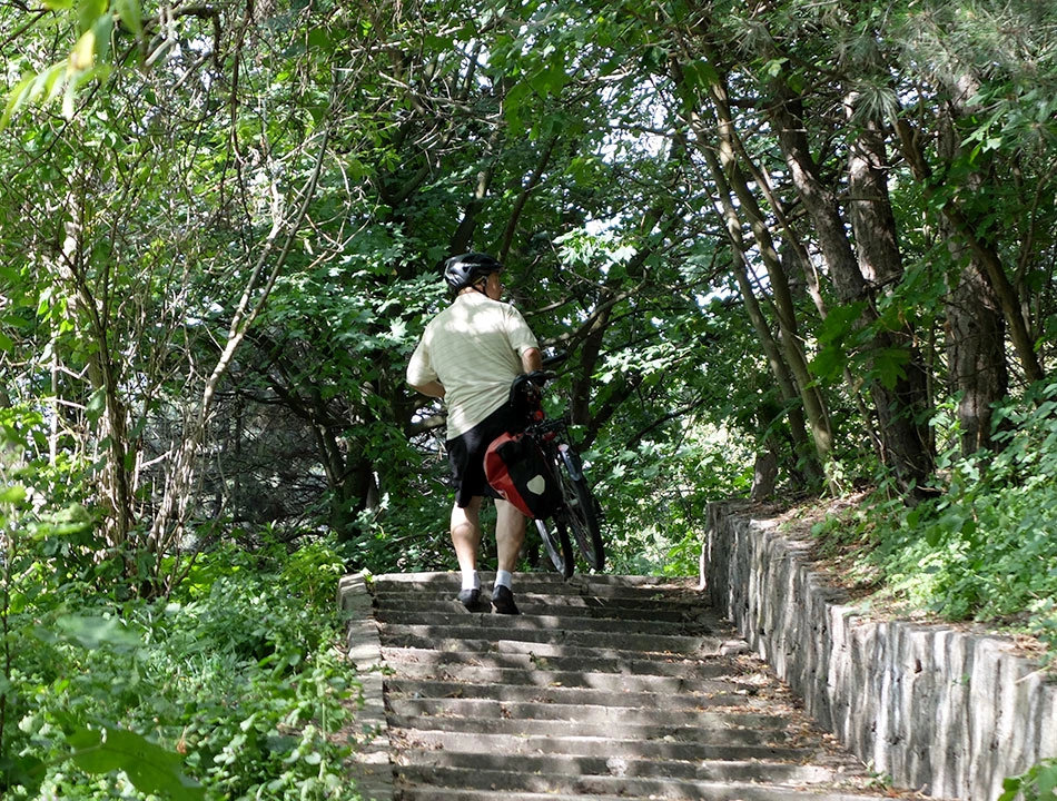 Na szczyt wiodą schody, my jednak wybieramy drogę wyżłobioną przez downhill'owców, którzy pędem mijają nas podczas ataku szczytowego. Powoli, jednak skutecznie i nieustępliwie wjeżdżamy na górę.
