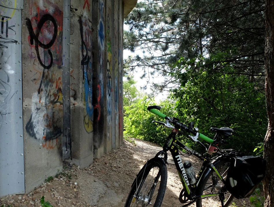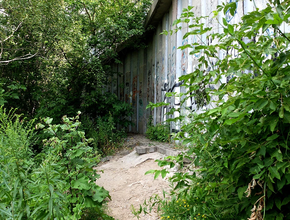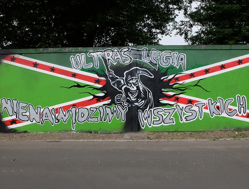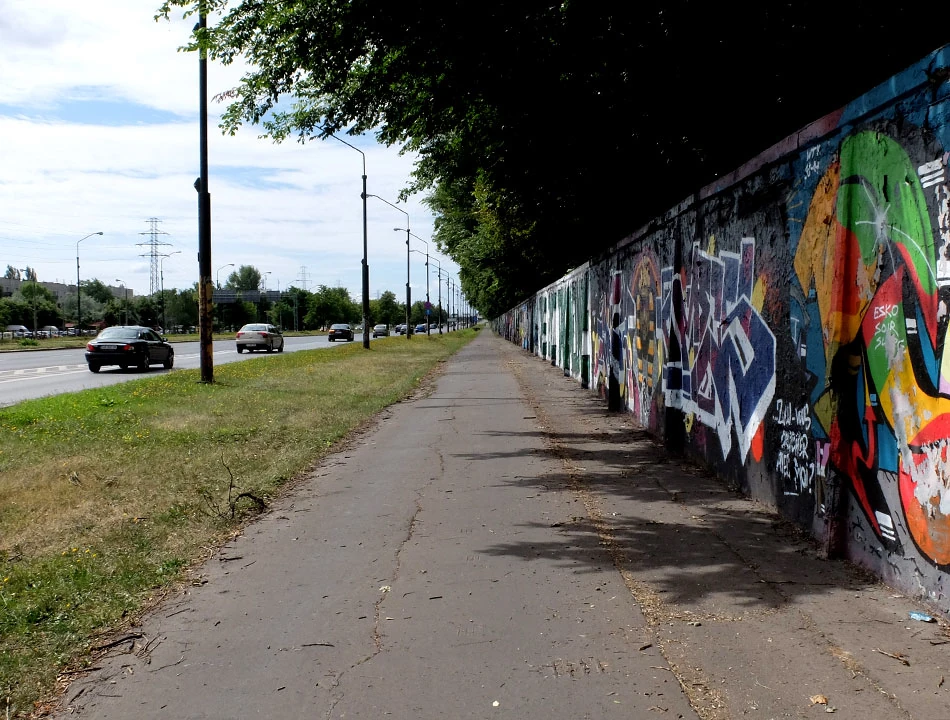 Rzymowskiego dojeżdżamy do Puławskiej i dalej jedziemy wzdłuż muru Toru Wyścigów Konnych na Służewcu. Mur stale żyje dzięki nieustannie tworzonym graffiti.