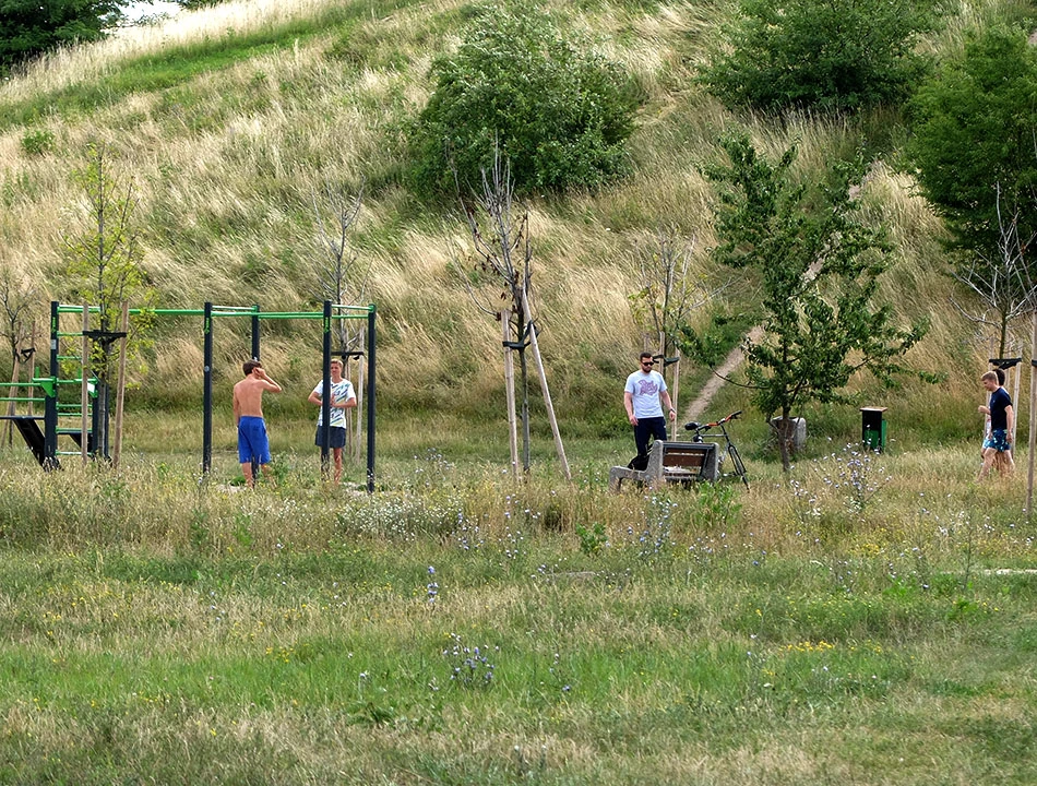 Górka Moczydłowska stawia opór. Piotrek wspina się z wielkim trudem na rowerze na sam szczyt. Marcin dostojnie maszeruje. Górkę usypano z ruin, zburzonej podczas II Wojny Światowej, Warszawy. W latach osiemdziesiątych był tam wyciąg narciarski. Teraz zostały po nim smętne słupy oświetleniowe. Jednak widok z góry wynagradza starania.