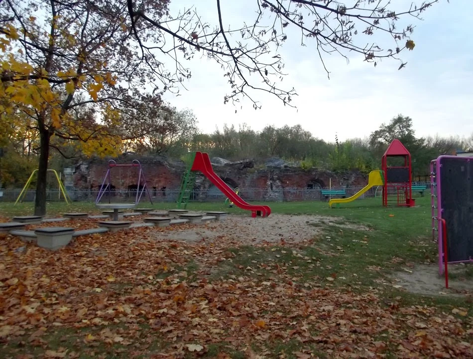 W na tyłach Mierosławskiego plac zabaw ciekawie kontrastuje z forteczną architekturą Cytadeli. Przez takie sąsiedztwo wojskowe zabudowania straciły swój militarny charakter.