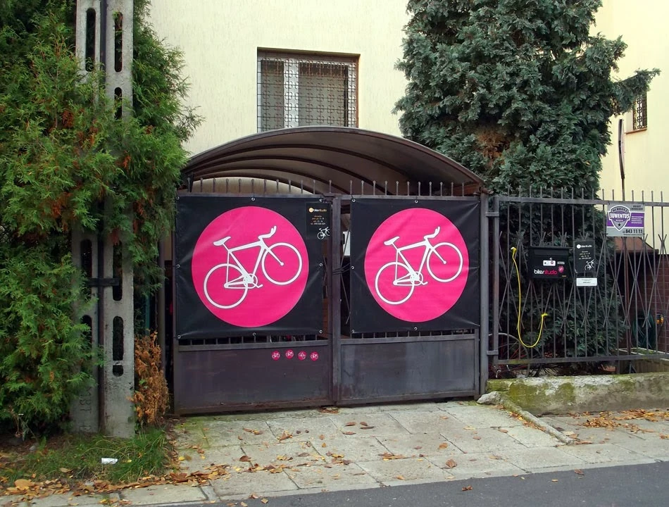 Mickiewicza zjeżdżamy na Marymont. Przy Cząstkowej ciekawie prezentuje się Biker Studio, które reklamuje się jako kolorowe ostre koło.