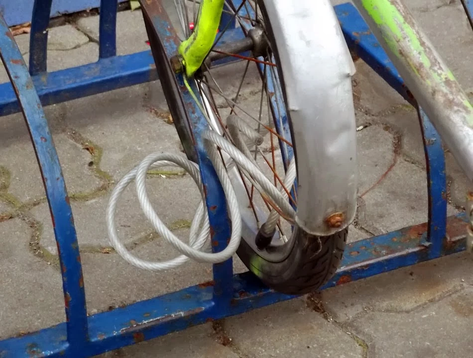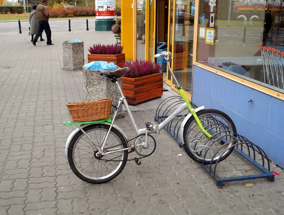 Przy placu Wilsona stoi składak, może trochę mniej zaawansowany technicznie od roweru Piotrka. Jest „przypięty” do stojaka przeciętą linką.