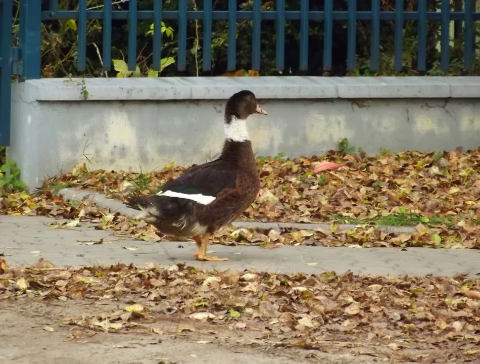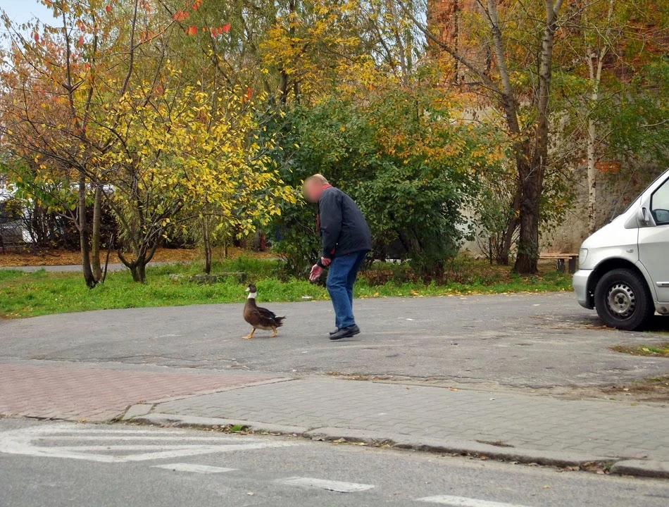 A tam pan wyprowadza na spacer gęś. Po chwili okazuje się, że to nie spacer tylko, godne podziwu, zabiegi chroniące gęś przed wpadnięciem pod przejeżdżające samochody. Piotrek dzwoni do Eko Patrolu Straży Miejskiej. Pan strażnik najpierw pyta czy gęś jest ranna, i gdy słyszy, że nie, odmawia przysłania patrolu. Po namowach Piotrka jednak przyjmuje zgłoszenie. My nie czekamy na efekt telefonu i zostawiamy gęś pod opieką lokalnej ludności.