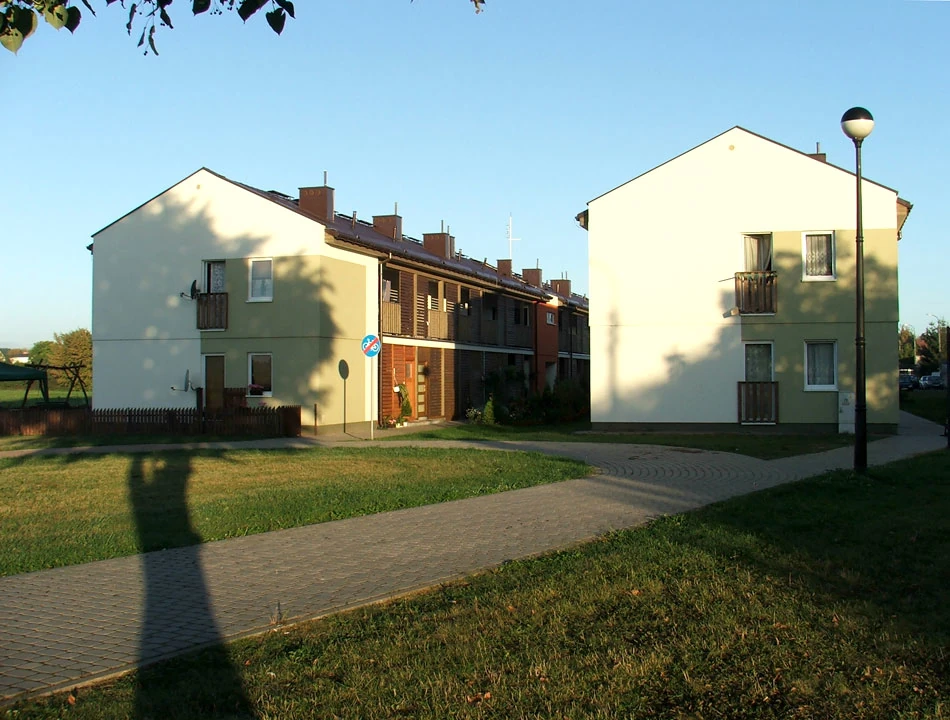 Przy skwerze, na ulicy Nadrzecznej wybudowano dwa szeregowce. Z daleka nawet nieźle wyglądają, ale z bliska sprawiają nieco klaustrofobiczne wrażenie.