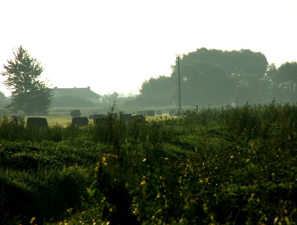 W oddali majaczą kościół i zielone łąki.