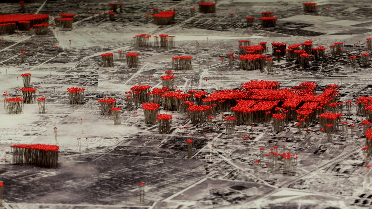 W pawilonie umieszczono wystawę opowiadającą o historii Cmentarza Powstańców Warszawy, a także pokazywana jest wystawa wskazująca miejsca egzekucji, tymczasowego pochówku i ekshumacji ofiar powstania. Miejsca te zaznaczono tysiącami czerwonych szpilek na mapie Warszawy skomponowanej z niemieckich zdjęć lotniczych.