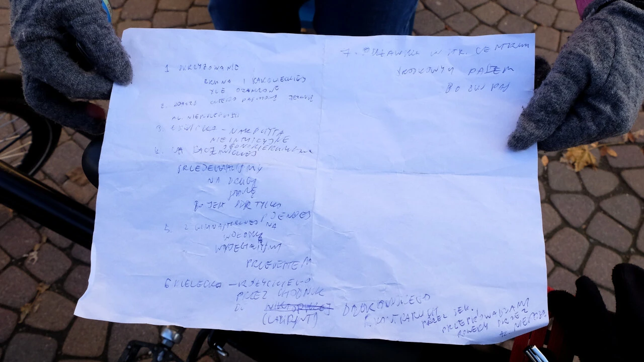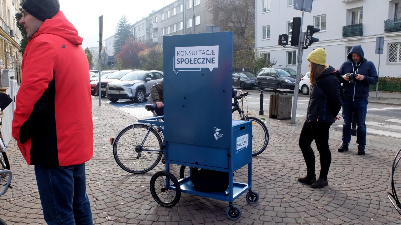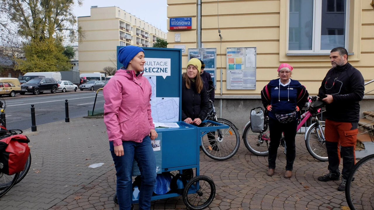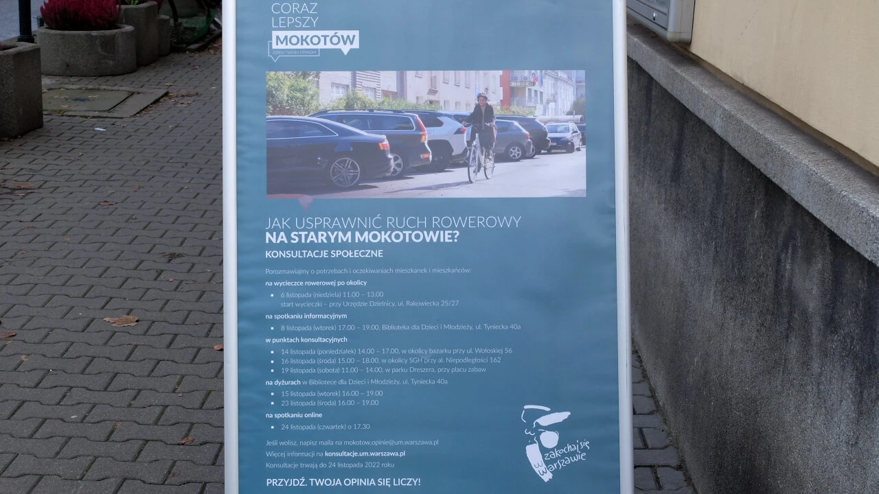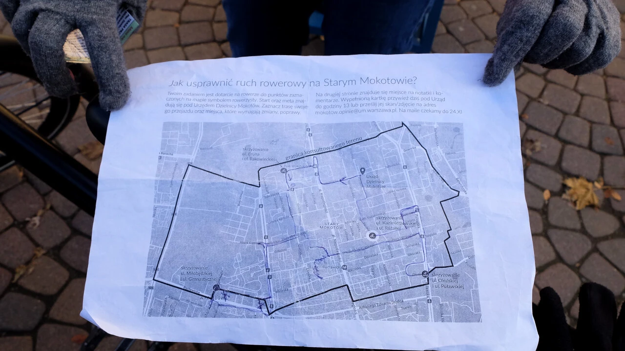 Tłumu nie ma. Jest trochę osób na rowerach, parę osób pieszo. Dopytują się o co chodzi, zgłaszają uwagi do zaproponowanych tras. Konsultacje trwają do 24 listopada i można wziąć w nich udział na wiele sposobów – my zdecydowaliśmy się na przejazd rowerowy. Efekty konsultacji posłużą do opracowania „Programu rozwoju ruchu rowerowego dla obszaru Starego Mokotowa”. Program stanie się podstawą przyszłych inwestycji Dzielnicy Mokotów tworzenia tras rowerowych. Dostaliśmy mapkę, na której wyznaczono punkty, do których mieliśmy dotrzeć. Pierwsze wrażenie jest takie, że bardzo źle się jeździ po Mokotowie rowerem; mało dróg dla rowerów, konieczność jazdy lub przecinania wielopasmowych ulic, wiele ulic jednokierunkowych.