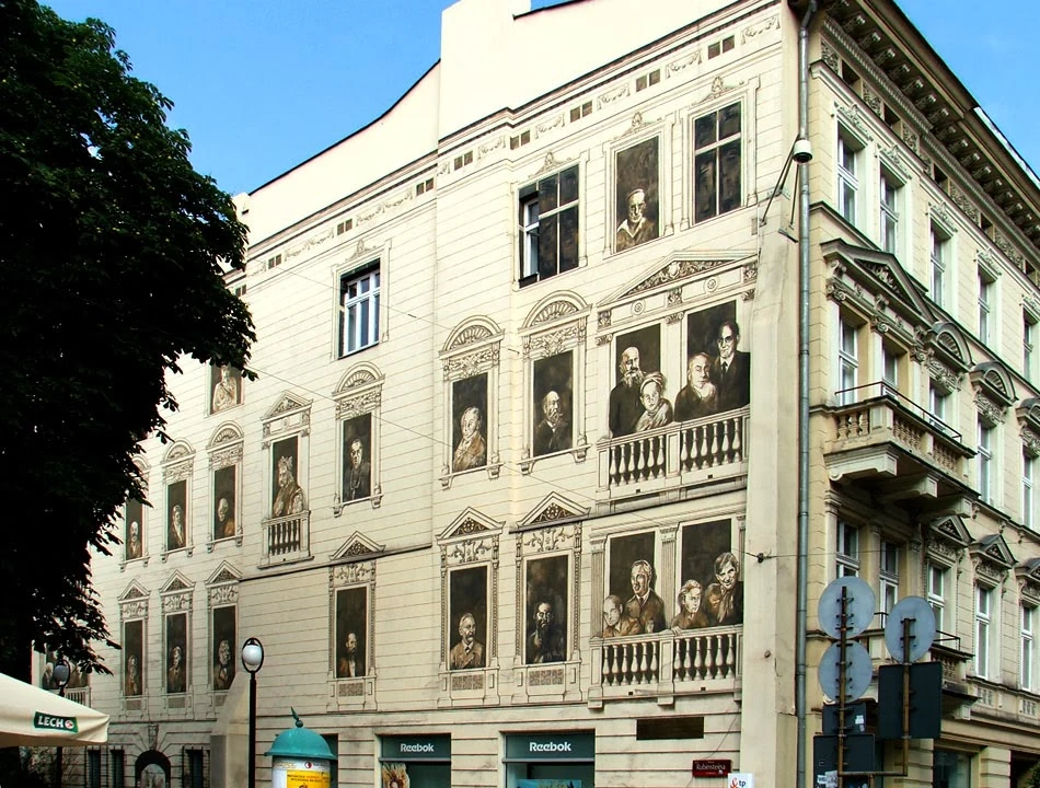 Zaraz obok, przy Piotrkowskiej 77, na ścianie dużej kamienicy widzimy mural z podobiznami ważnych dla Łodzi osobistości. Jest tam Piłsudski (jak wiadomo ważny dla Polski w ogóle, a w dodatku w Łodzi prowadził tajną drukarnię). Jagiełło, bo nadał prawa miejskie Łodzi. Aleksander Kamiński, autor Kamieni na szaniec, po wojnie do początku lat siedemdziesiątych mieszkał i pracował w Łodzi. Reymont wiadomo za co. Tuwim, bo piękne wiersze pisał, a poza tym urodził się i wychował w Łodzi. Jest tam także anonimowy tkacz i anonimowy Żyd, bez których miasto nie osiągnęłoby takiego rozkwitu. Kowlak też ma nadzieję być kiedyś jedną z postaci muralu; przyjedziemy obejrzeć i nawet się tam sfotografujemy.