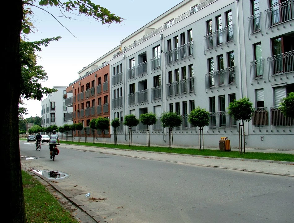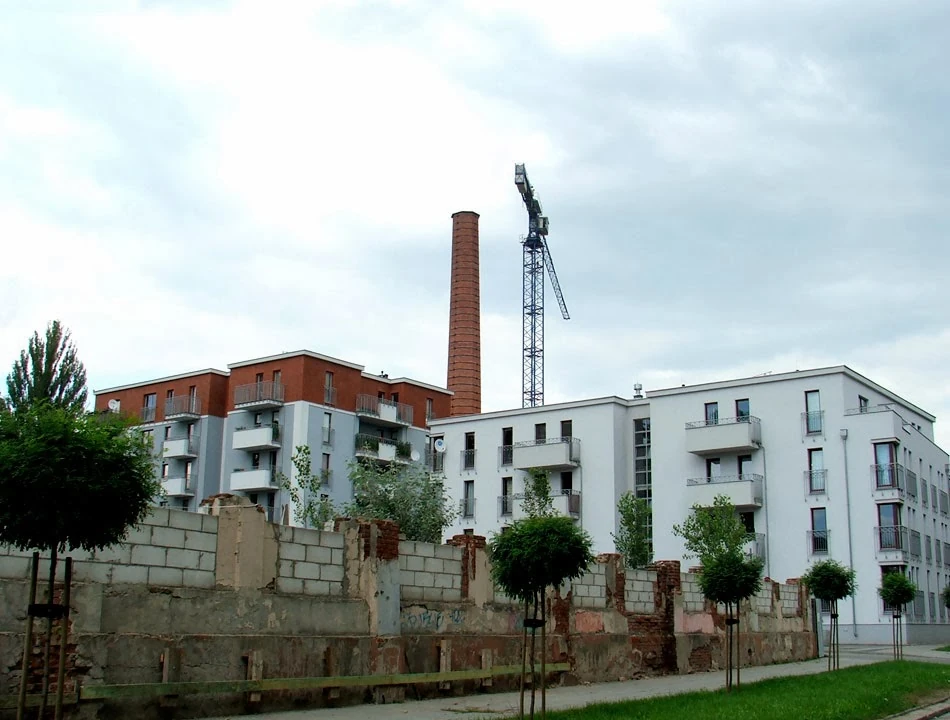 Targową, Tylną i Tymienieckiego dojeżdżamy do Piotrkowskiej, po drodze mijając ciekawe nowe osiedle wpisujące się w pofabryczny klimat Łodzi.