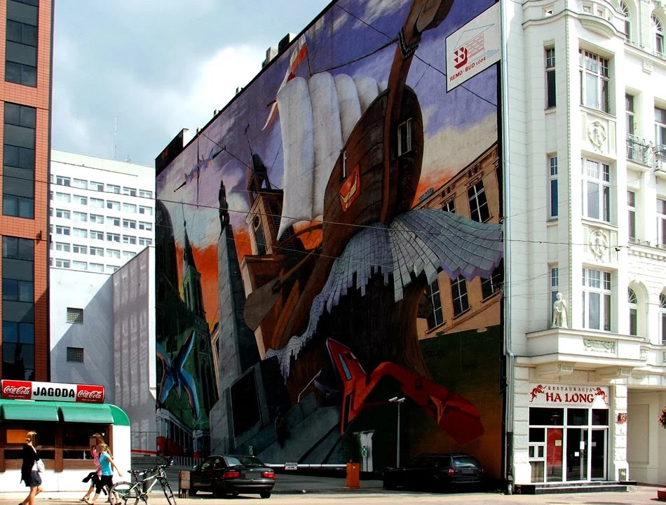 Już na samej Piotrkowskiej, na rogu Piłsudskiego, oglądamy wielki mural o powierzchni 600m2. To chyba największy mural w Europie.