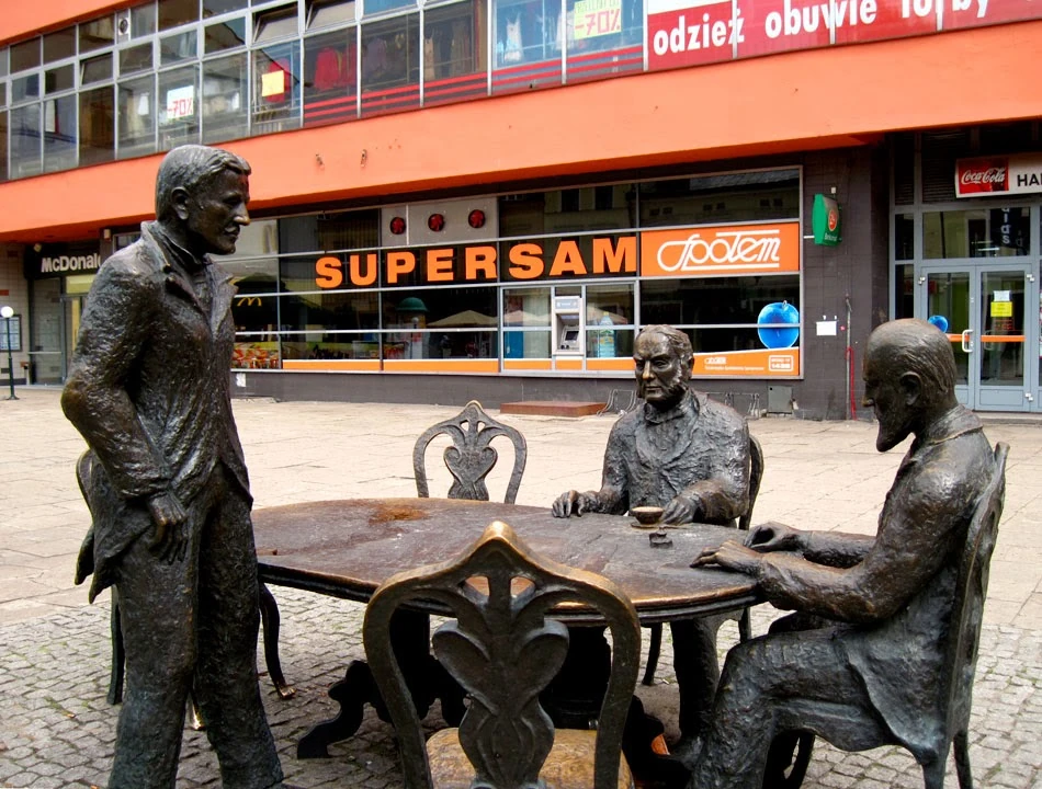 Dalej, przy Jaracza następny pomnik z serii galerii wielkich łodzian. Przy stole trzech dżentelmenów omawia ważne sprawy. I musiały to być rzeczy istotne bo rozmawiają Izrael Poznański, Karol Scheibler i Ludwik Grohman. Ci trzej przedsiębiorcy znani są jako twórcy łódzkiego przemysłu i mieli gigantyczny wpływ na kształt i rozwój miasta.