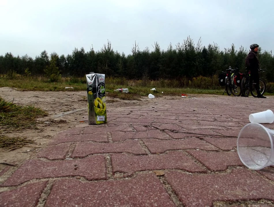 W Starej Papierni zatrzymujemy się na kawę. Pałaszujemy wypieki u Bliklego, swoją drogą ceny jak z kosmosu, gdy wpada jakiś facet i rzuca: — Czyje są te rowery przypięte do słupa? Malowanie słupów kosztowało nas 25 tysięcy, a słup jest podrapany. Po czym wybiega. Scena jak z amatorskiego teatru. Rzeczywiście przypięliśmy rowery do słupa, bo Stara Papiernia oferuje jedynie stojaki typu „wyrwikółko”. Oglądamy słup: są zadrapania, ale nie powstały dzięki naszym rowerom.
