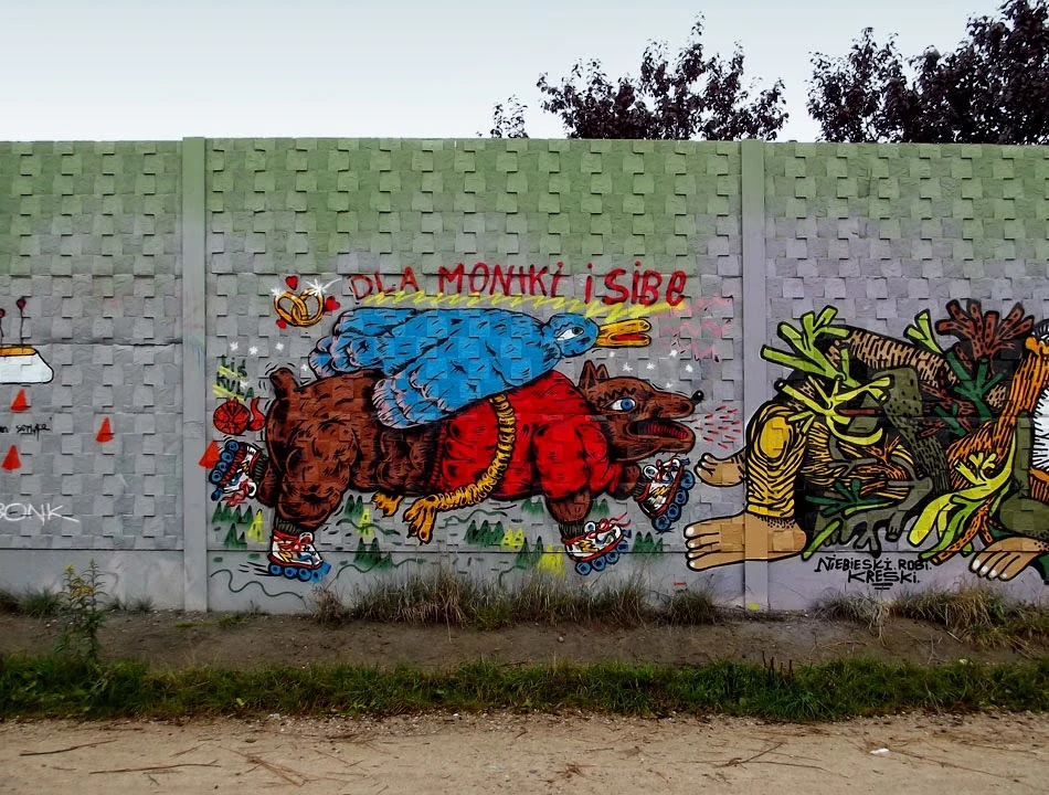 Obok betonowego muru wjeżdżamy do Lasu Kabackiego. Sam mur to dość duża galeria na świeżym powietrzu. Okolica nosi ślady wczorajszych balang, też na świeżym powietrzu.
