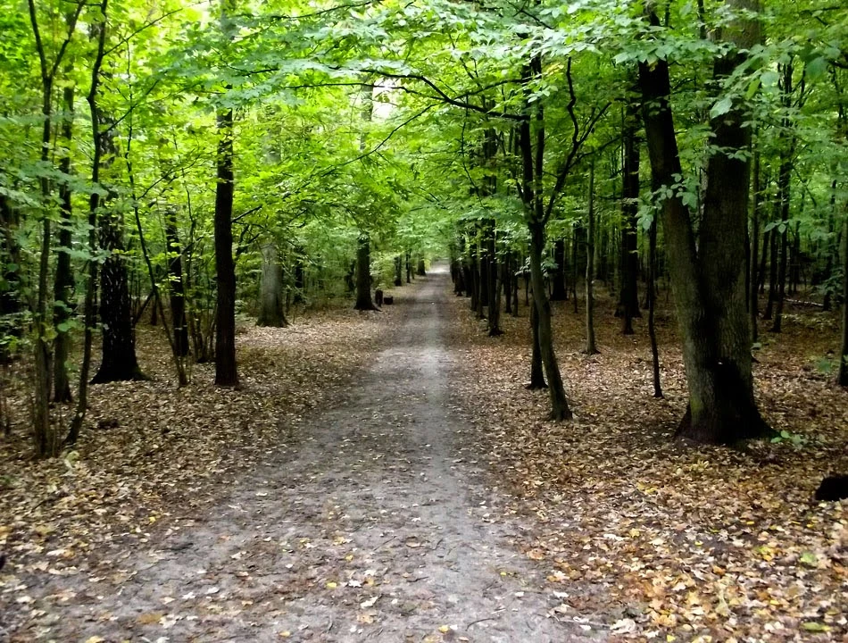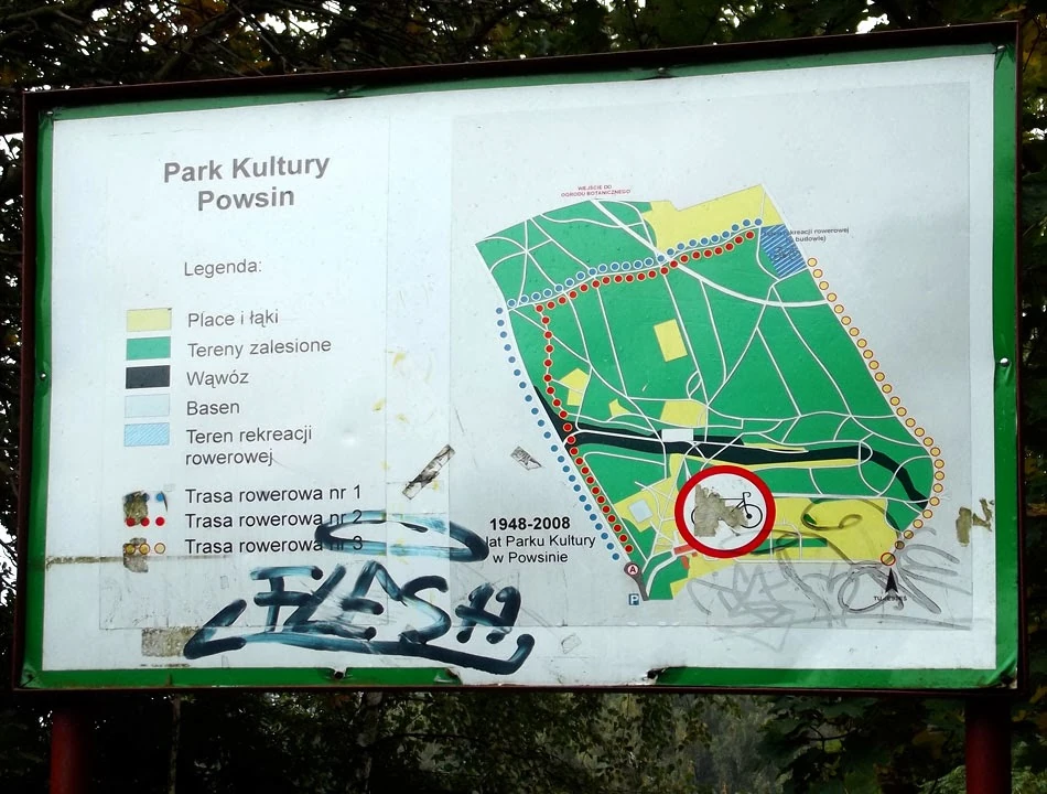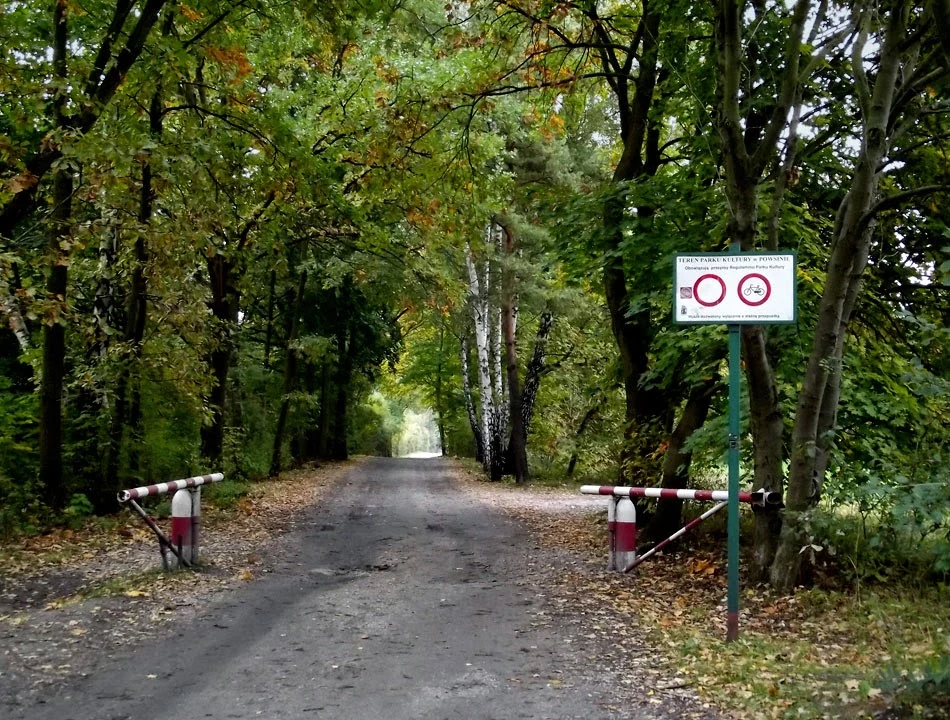 Kręcimy trochę po lesie i lądujemy przy wjeździe do Parku Kultury w Powsinie, ale tu nas nie chcą – na rowerze zabronione.