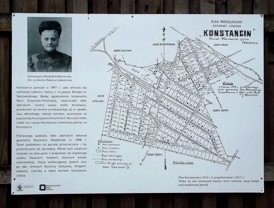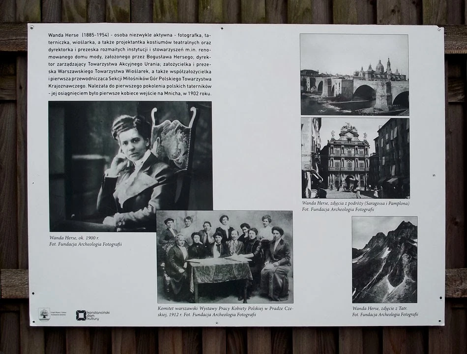 Na płocie przy ulicy Piłsudskiego, wisi wystawa z okazji 105 lecia Konstancina. Zatrzymujemy się przy zdjęciach ważnych dla miejscowości kobiet. Konstancji Skórzewskiej, od której imienia Konstancin wziął swą nazwę. I Wandy Herse: wioślarki, taterniczki, fotografki.
