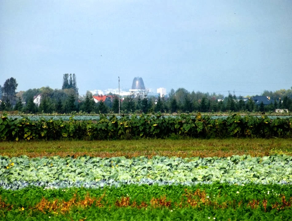 Okrzewską jedziemy w stronę Okrzeszyna, a potem w stronę Wisły. W oddali majaczy komin Papierni i „silos” Świątyni Opatrzności.