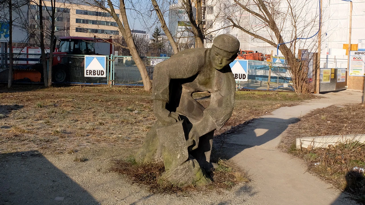 W miejscu gdzie Suwak wchodzi między bloki, obok czegoś co na mapie nazywa się Park Rozwoju znajdujemy kamienną rzeźbę. Klimat jakby socrealistyczny, Piotrek podejrzewa jednak współczesną stylizację. Znajdujemy informację, że to raczej stara rzeźba znaleziona na terenie magazynów Przedsiębiorstwa Budownictwa Uprzemysłowionego Warszawa Północ, które zostały rozebrane by wybudować osiedle. Pogratulować tym, którzy ocalili trochę ducha robotniczego Służewca.