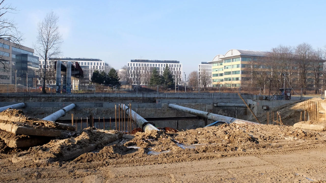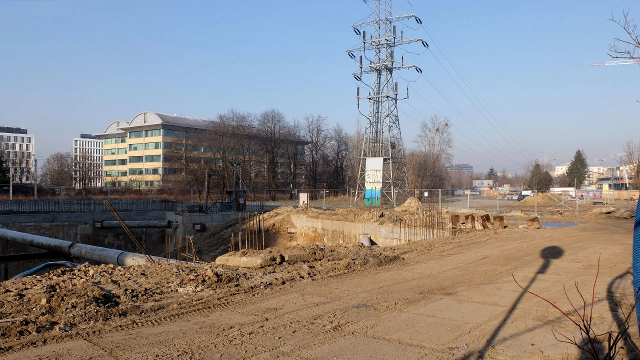 Z tyłu zostawiamy nieotwartą, ale już prawie gotową estakadę na Postępu, nad Marynarską.