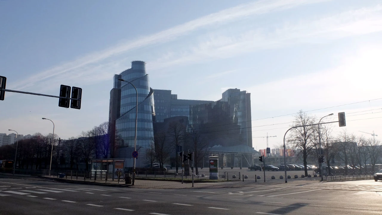 Jedziemy Woronicza w stronę TVP. Nowy gmach jest klasycznym gargamelem. Autorem dzieła jest Czesław Bielecki, architekt.