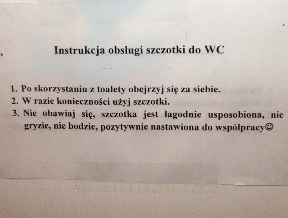 W okolicy Kępy Radwankowskiej zatrzymujemy się na stacji benzynowej by się trochę posilić, ogrzać i dać odpocząć naszym czterem literom. Obu nas, niezależnie od siebie, ujmuje instrukcja obsługi szczotki do WC. Jej prostota i bezpośredniość dobrze świadczą o autorze.