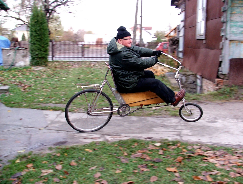 Nam nie udaje się na nim pojechać. Marcinowi spodobał się najbardziej praktyczny rower transportowy. Ciekawie też wyglądają rowery poziome. Zaintrygowała nas hulajnoga napędzana podobnie jak maszyna do szycia, ale też hulajnoga dla całkiem dorosłych osób.