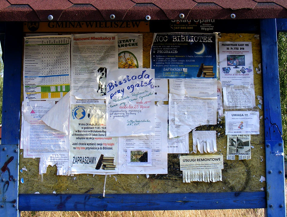Gminna tablica ogłoszeń lekko nieaktualna, zaprasza między innymi na imprezę w lipcu. Najbardziej aktualne jest ogłoszenie o zaginionej kotce. Mamy nadzieję, że informacje o szlakach rowerowych są bardziej aktualne.