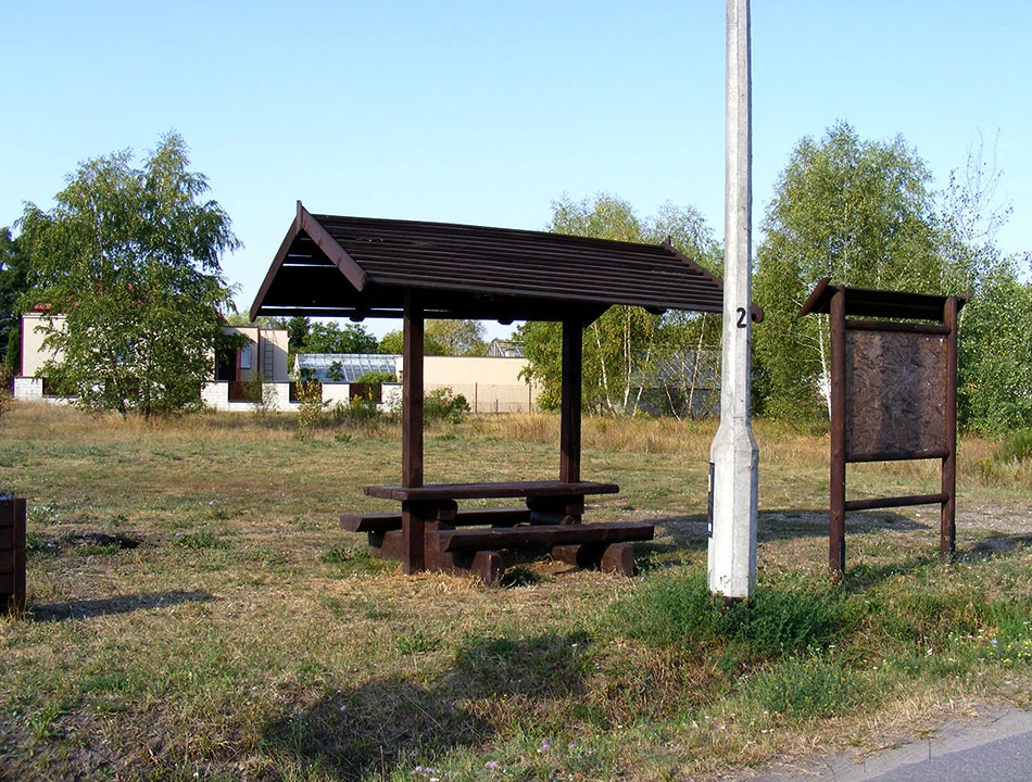 Niedaleko stacji napotykamy wiatę przypominającą jedną z tych, jakie widzieliśmy podczas podróży Zgorzelec — Szczecin.