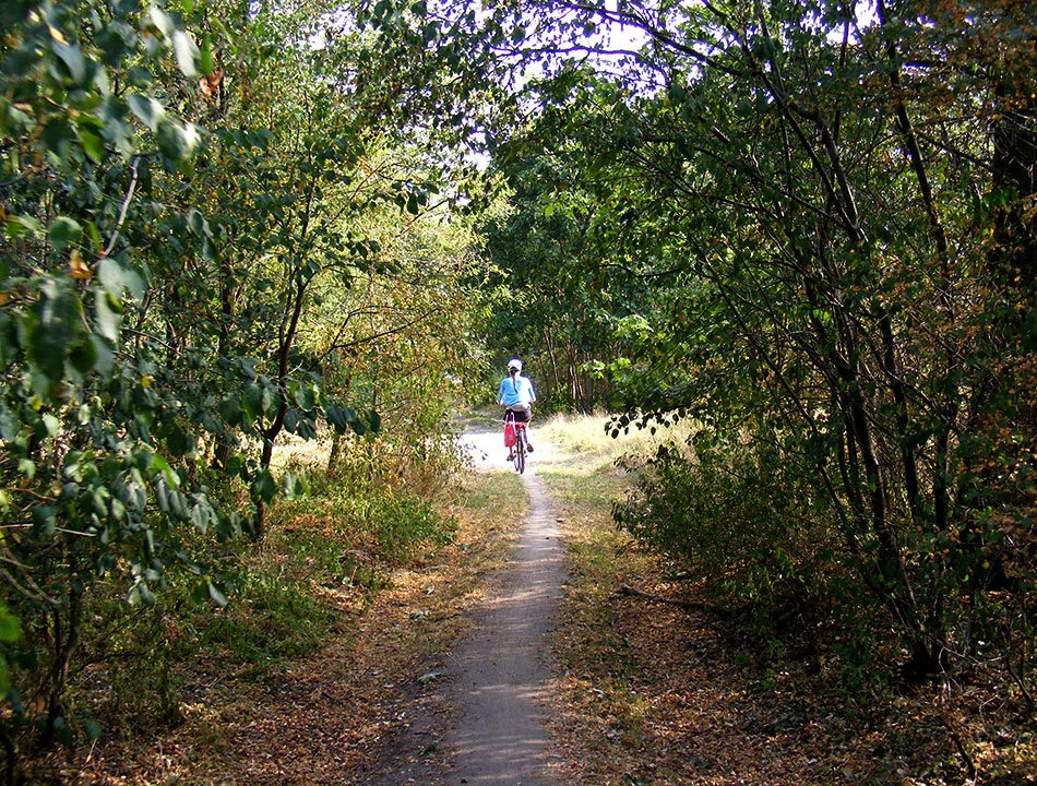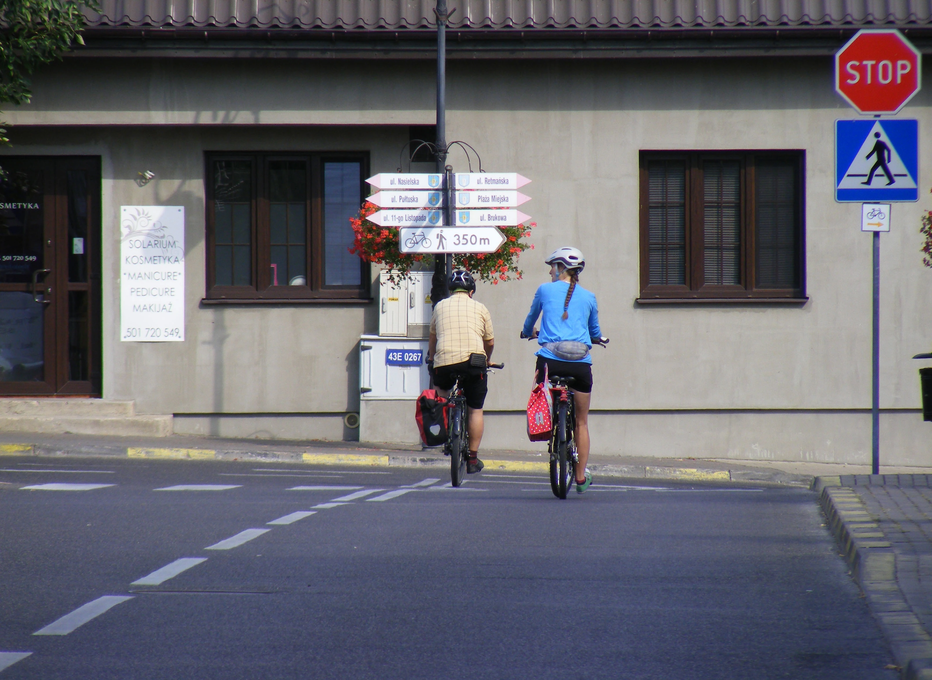 Droga dla rowerów biegnie raz po jednej, raz po drugiej stronie drogi numer 61. Chwilę też prowadzi szutrówką między krzakami. Zostawiamy za sobą Borową Górę i Stasi Las. Odwołań i apeli do żeńskiej części ludzkości jest w okolicy więcej.